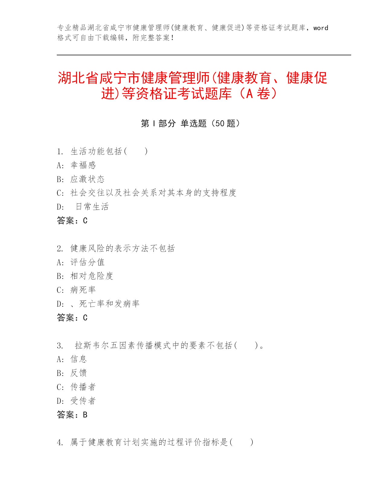 专业精品湖北省咸宁市健康管理师(健康教育、健康促进)等资格证考试题库,word格式可自由下载编辑,附完整答案!湖北省咸宁市健康管理师(健康教育、健康促进)等资格证考试题库(A卷)第I部分单选题(50题)1.生活功能包括()A:幸福感B:应激状态C:社会交往以及社会关系对其本身的支持程度D:日常生活答案:C2.健康风险的表示方法不包括A:评估分值B:相对危险度C:病死率D:、死亡率和发病率答案:C3.拉斯韦尔五因素传播模式中的要素不包括()。A:信息B:反馈C:传播者D:受传者答案:B4.属于健康教育计划实