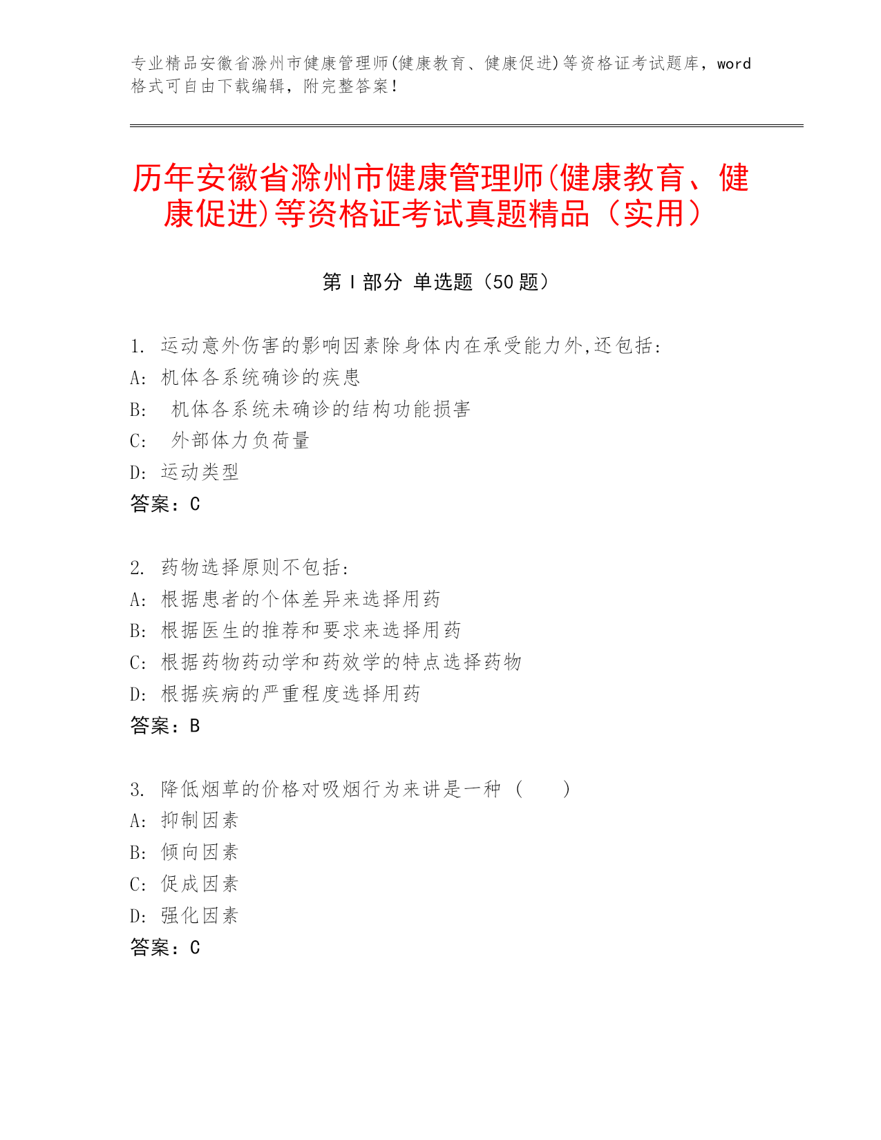 历年安徽省滁州市健康管理师(健康教育、健康促进)等资格证考试真题精品(实用).docx