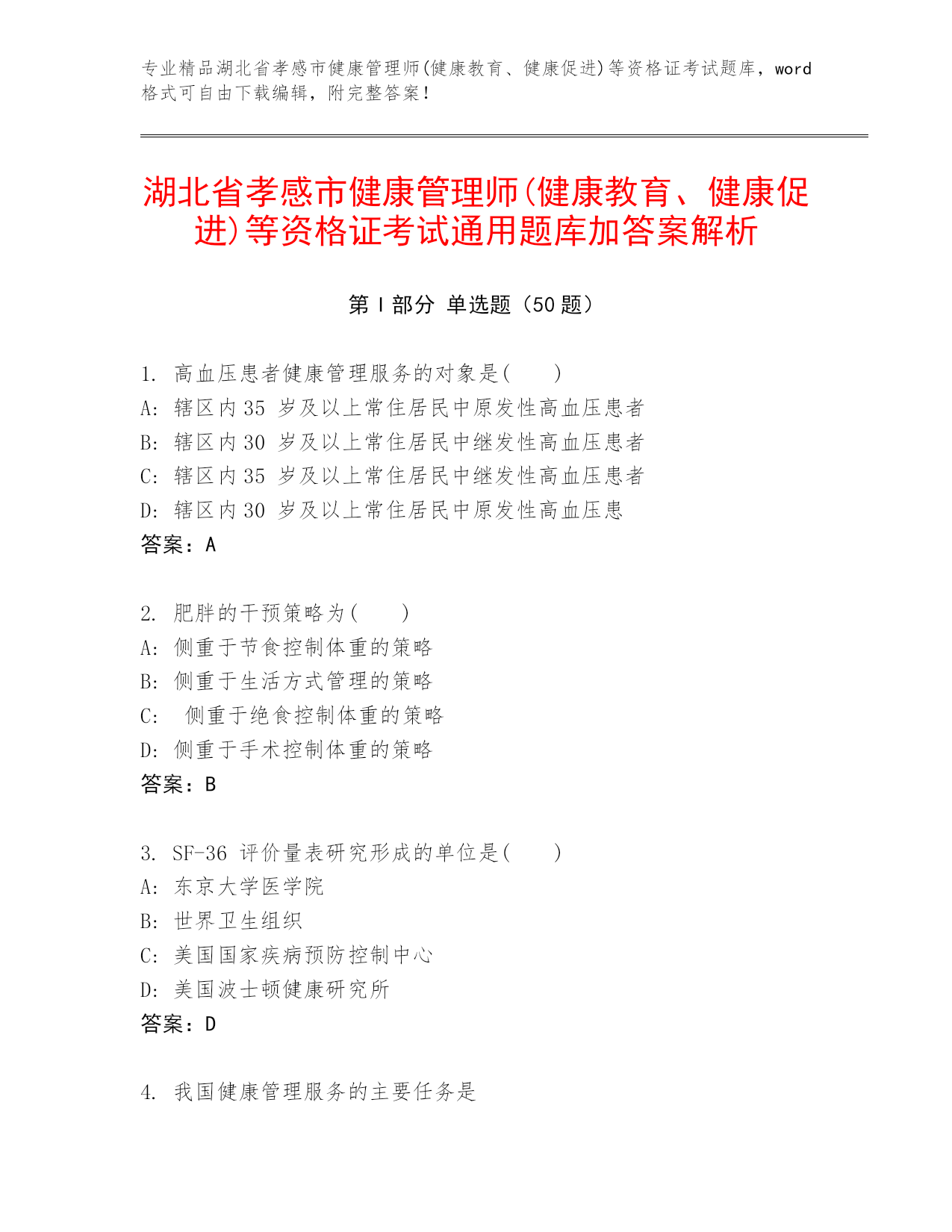 湖北省孝感市健康管理师(健康教育、健康促进)等资格证考试通用题库加答案解析.docx