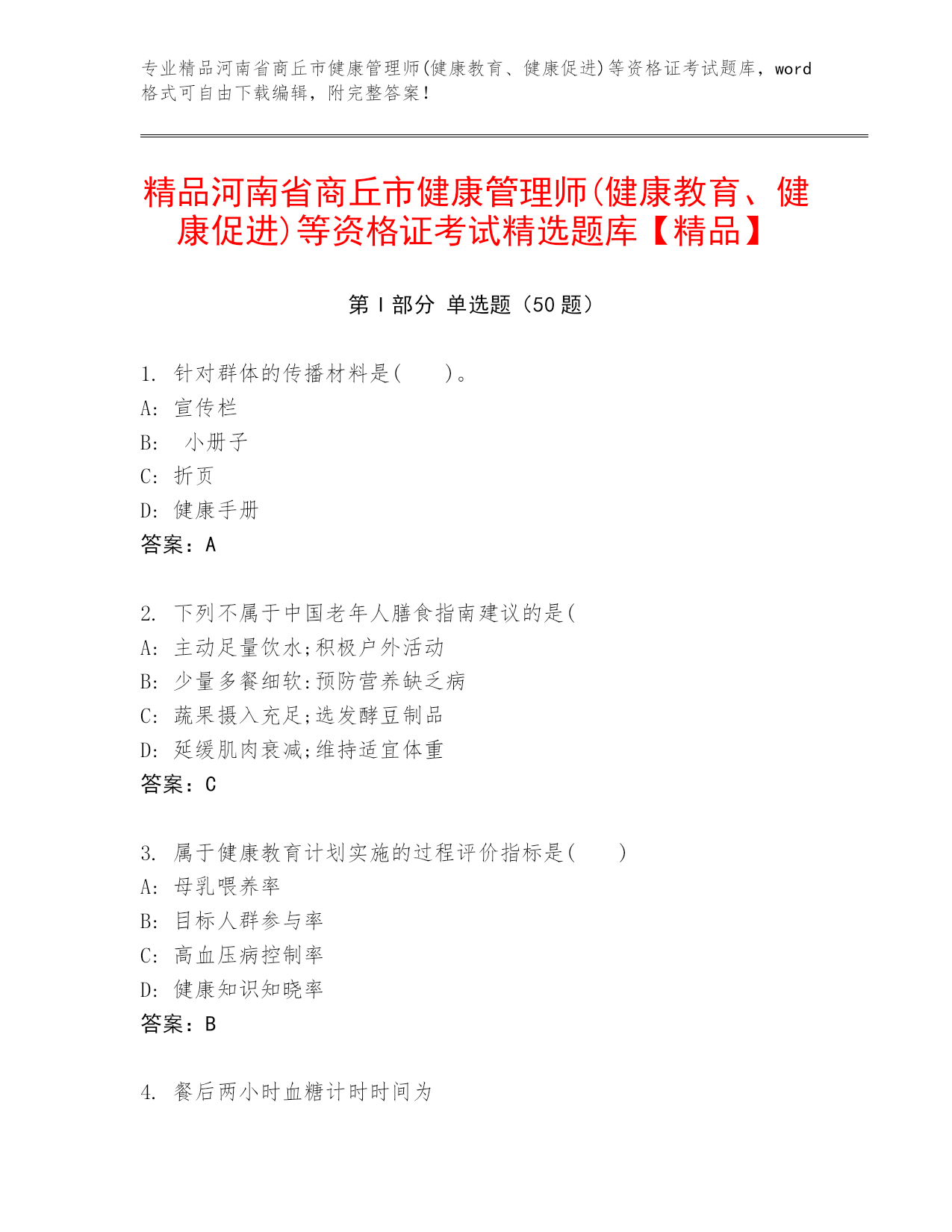 专业精品河南省商丘市健康管理师(健康教育、健康促进)等资格证考试题库,word格式可自由下载编辑,附完整答案!精品河南省商丘市健康管理师(健康教育、健康促进)等资格证考试精选题库【精品】第I部分单选题(50题)1.针对群体的传播材料是()。A:宣传栏B:小册子C:折页D:健康手册答案:A2.下列不属于中国老年人膳食指南建议的是(A:主动足量饮水;积极户外活动B:少量多餐细软:预防营养缺乏病C:蔬果摄入充足;选发酵豆制品D:延缓肌肉衰减;维持适宜体重答案:C3.属于健康教育计划实施的过程评价指标是()A:母