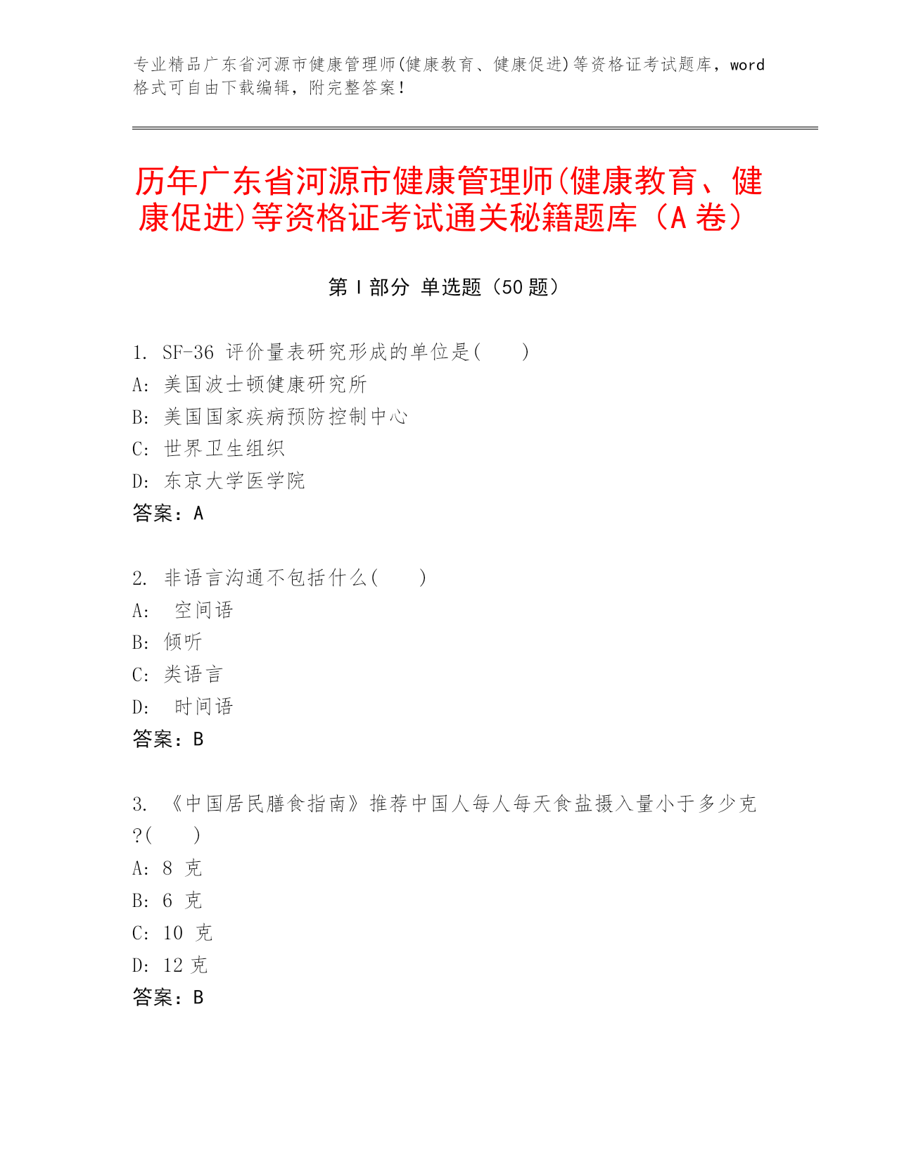 专业精品广东省河源市健康管理师(健康教育、健康促进)等资格证考试题库,word格式可自由下载编辑,附完整答案!历年广东省河源市健康管理师(健康教育、健康促进)等资格证考试通关秘籍题库(A卷)第I部分单选题(50题)1.SF-36评价量表研究形成的单位是()A:美国波士顿健康研究所B:美国国家疾病预防控制中心C:世界卫生组织D:东京大学医学院答案:A2.非语言沟通不包括什么()A:空间语B:倾听C:类语言D:时间语答案:B3.《中国居民膳食指南》推荐中国人每人每天食盐摄入量小于多少克?()A:8克B:6克C