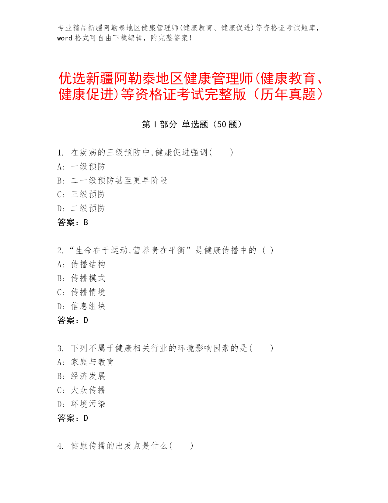优选新疆阿勒泰地区健康管理师(健康教育、健康促进)等资格证考试完整版(历年真题).docx