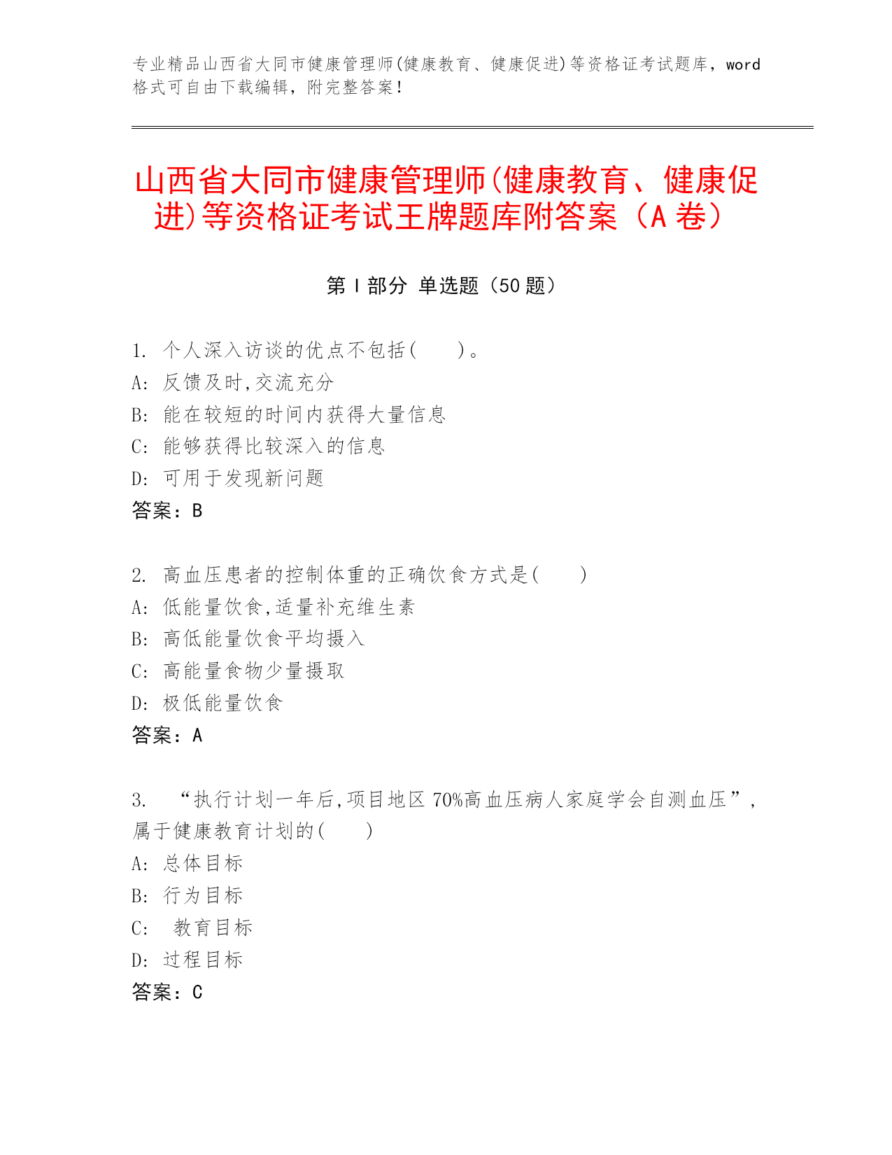 山西省大同市健康管理师(健康教育、健康促进)等资格证考试王牌题库附答案(A卷).docx