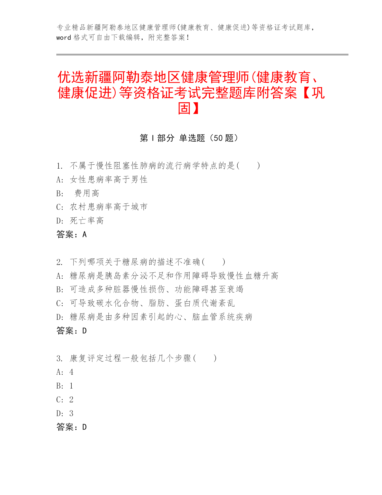 优选新疆阿勒泰地区健康管理师(健康教育、健康促进)等资格证考试完整题库附答案【巩固】.docx