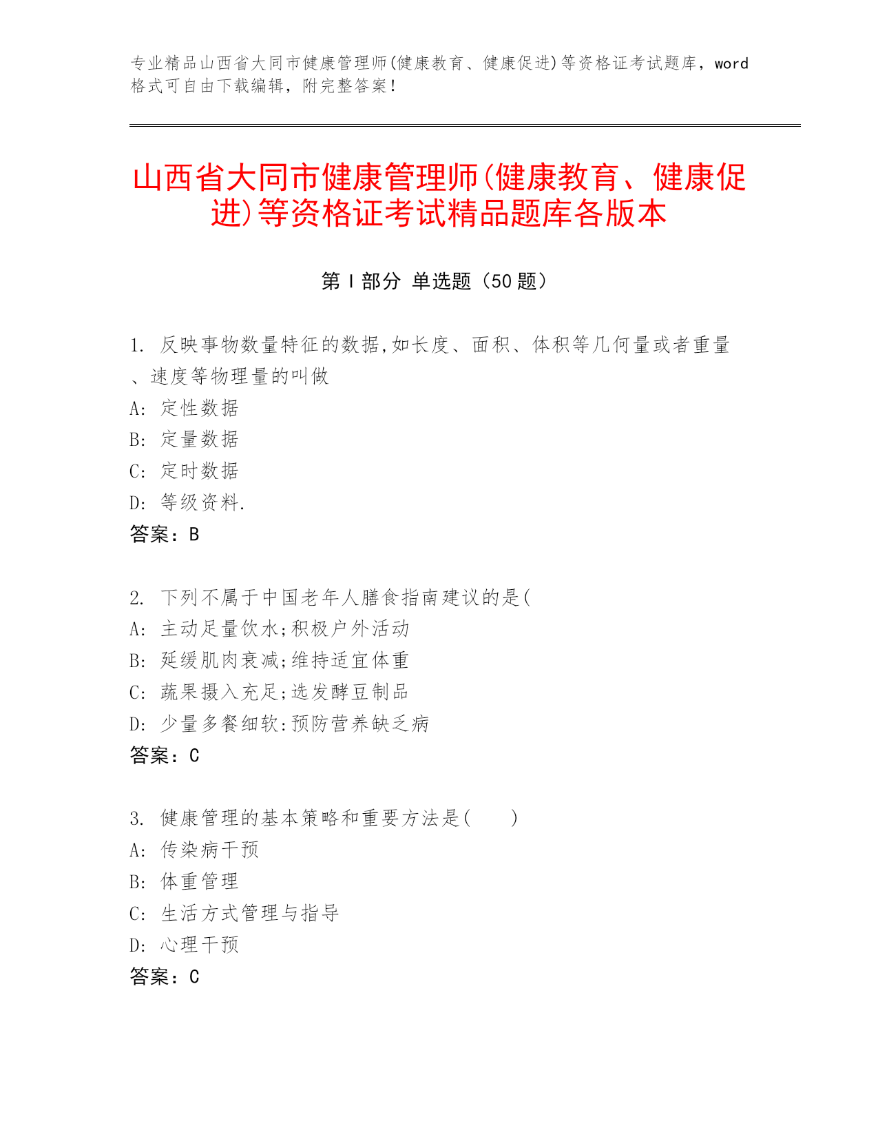 山西省大同市健康管理师(健康教育、健康促进)等资格证考试精品题库各版本.docx