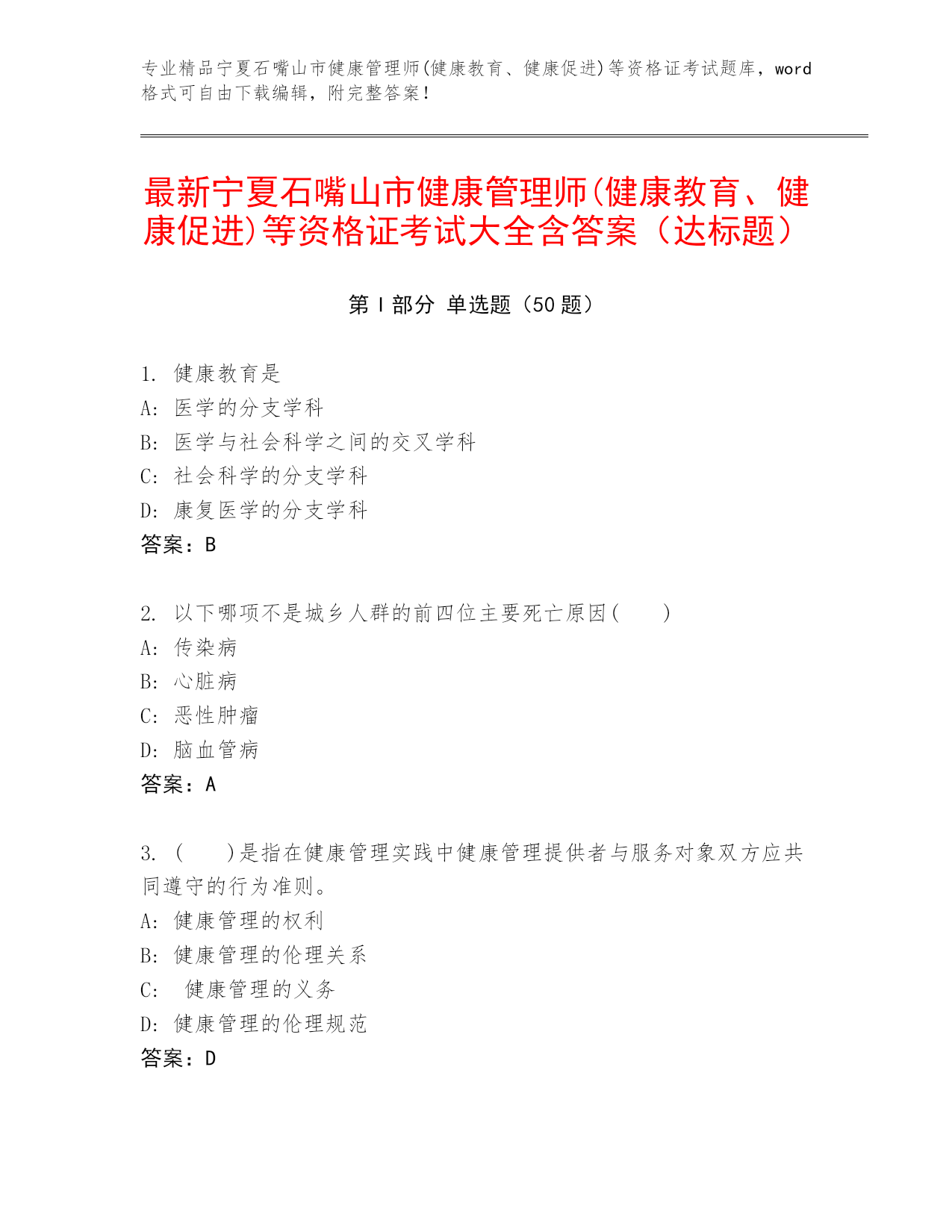 最新宁夏石嘴山市健康管理师(健康教育、健康促进)等资格证考试大全含答案(达标题).docx