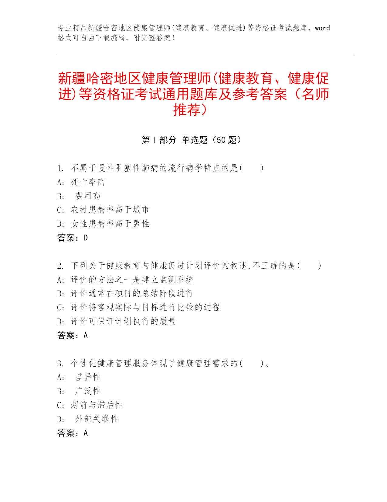 新疆哈密地区健康管理师(健康教育、健康促进)等资格证考试通用题库及参考答案(名师推荐).docx