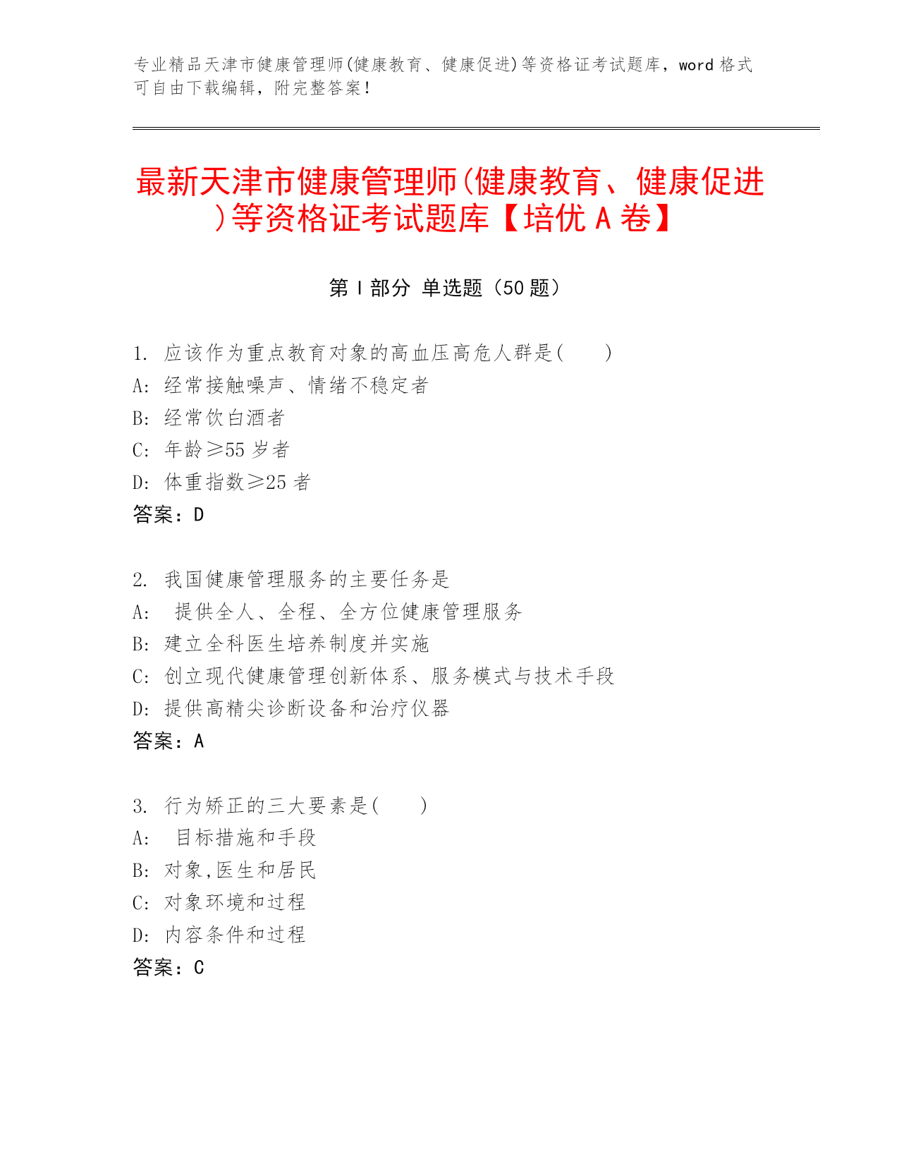 最新天津市健康管理师(健康教育、健康促进)等资格证考试题库【培优A卷】.docx