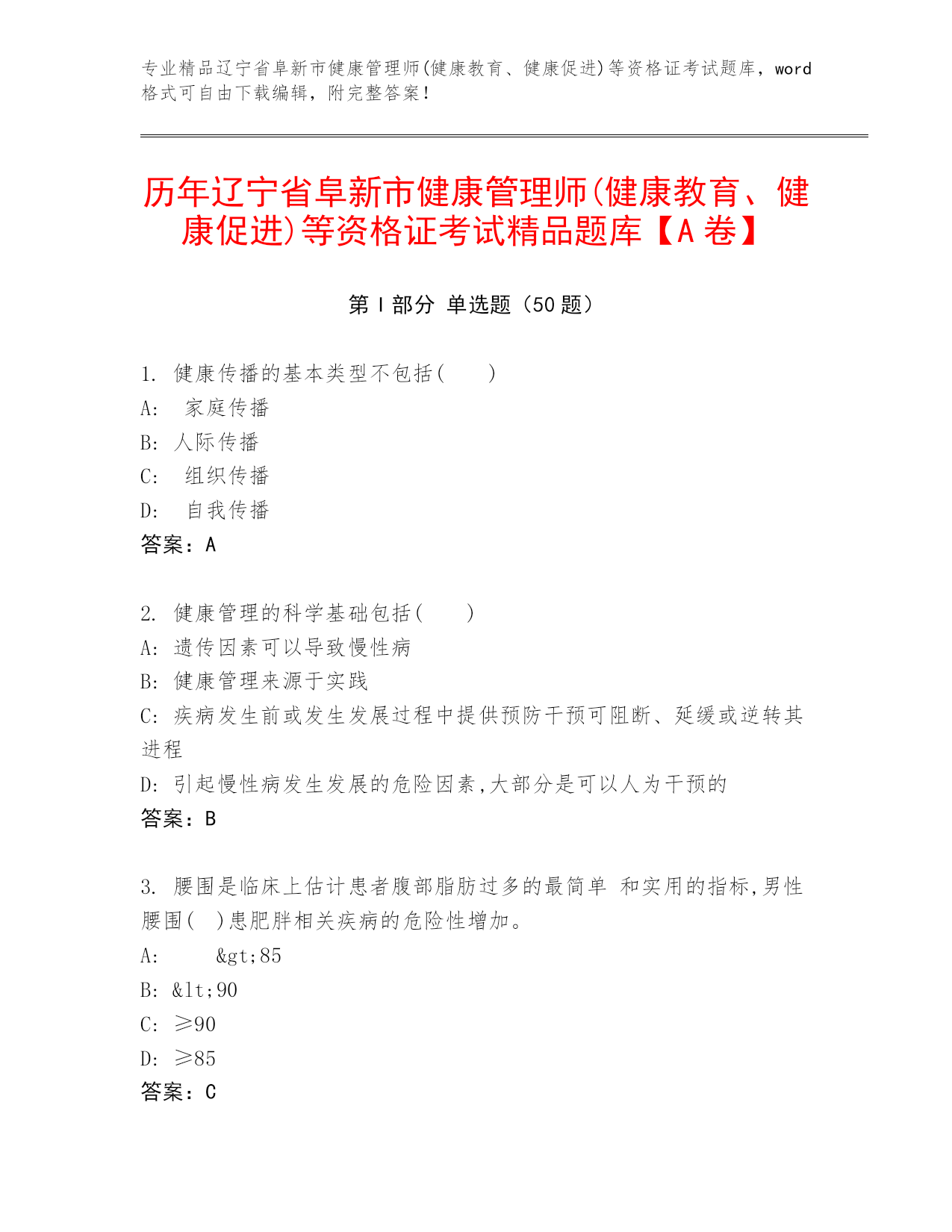 历年辽宁省阜新市健康管理师(健康教育、健康促进)等资格证考试精品题库【A卷】.docx