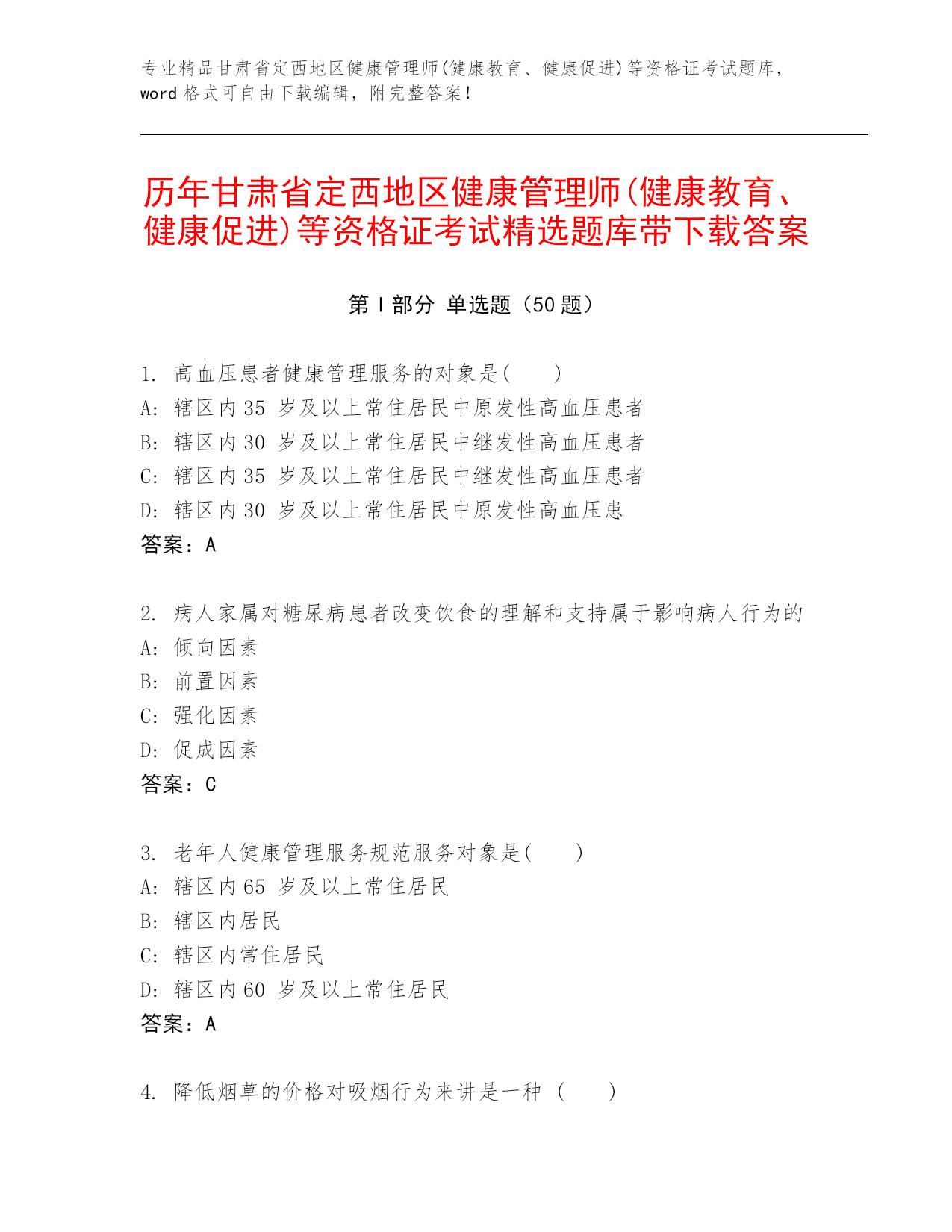历年甘肃省定西地区健康管理师(健康教育、健康促进)等资格证考试精选题库带下载答案.docx