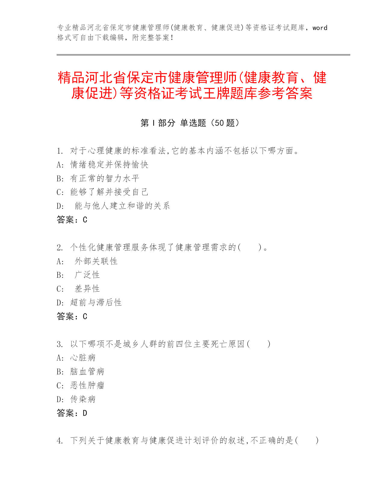 精品河北省保定市健康管理师(健康教育、健康促进)等资格证考试王牌题库参考答案.docx
