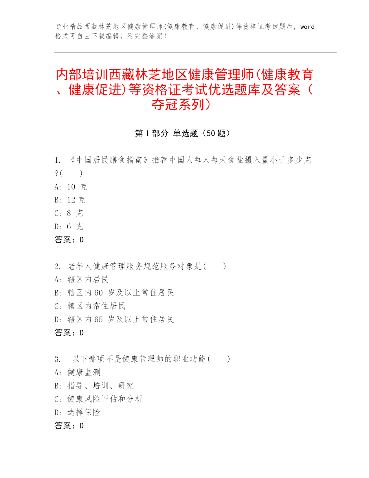 内部培训西藏林芝地区健康管理师(健康教育、健康促进)等资格证考试优选题库及答案(夺冠系列).docx