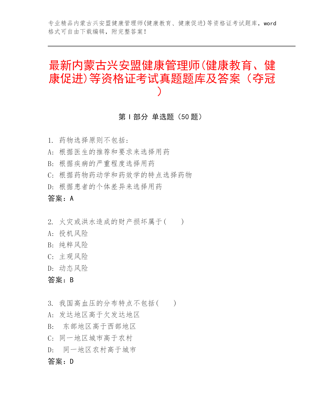 专业精品内蒙古兴安盟健康管理师(健康教育、健康促进)等资格证考试题库,word格式可自由下载编辑,附完整答案!最新内蒙古兴安盟健康管理师(健康教育、健康促进)等资格证考试真题题库及答案(夺冠)第I部分单选题(50题)1.药物选择原则不包括:A:根据医生的推荐和要求来选择用药B:根据疾病的严重程度选择用药C:根据药物药动学和药效学的特点选择药物D:根据患者的个体差异来选择用药答案:A2.火灾或洪水造成的财产损坏属于()A:投机风险B:纯粹风险C:主观风险D:动态风险答案:B3.我国高血压的分布特点不包括()