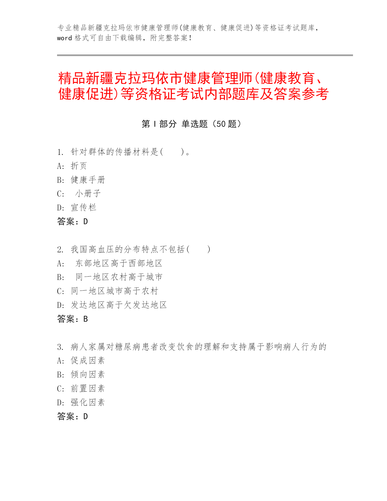 专业精品新疆克拉玛依市健康管理师(健康教育、健康促进)等资格证考试题库,word格式可自由下载编辑,附完整答案!精品新疆克拉玛依市健康管理师(健康教育、健康促进)等资格证考试内部题库及答案参考第I部分单选题(50题)1.针对群体的传播材料是()。A:折页B:健康手册C:小册子D:宣传栏答案:D2.我国高血压的分布特点不包括()A:东部地区高于西部地区B:同一地区农村高于城市C:同一地区城市高于农村D:发达地区高于欠发达地区答案:B3.病人家属对糖尿病患者改变饮食的理解和支持属于影响病人行为的A:促成因素B