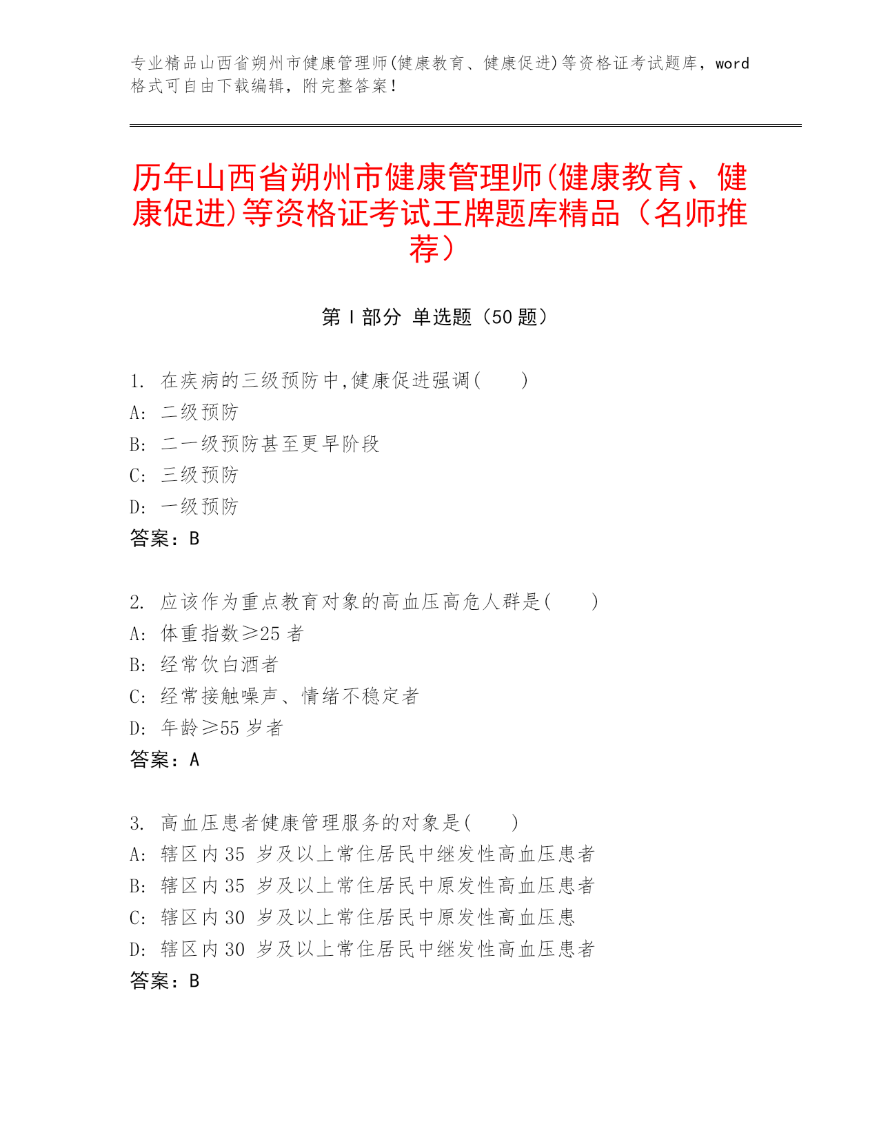 历年山西省朔州市健康管理师(健康教育、健康促进)等资格证考试王牌题库精品(名师推荐).docx
