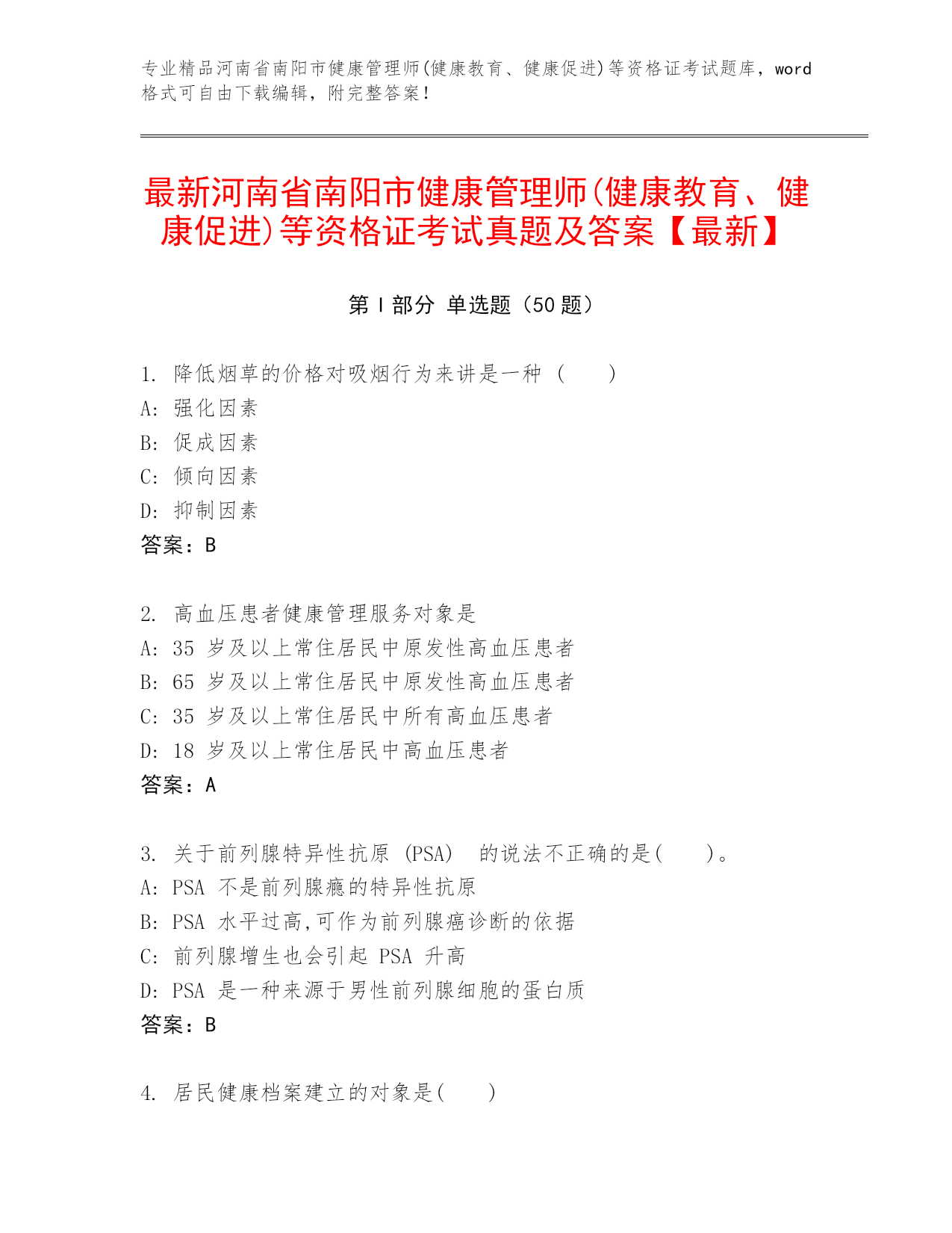 专业精品河南省南阳市健康管理师(健康教育、健康促进)等资格证考试题库,word格式可自由下载编辑,附完整答案!最新河南省南阳市健康管理师(健康教育、健康促进)等资格证考试真题及答案【最新】第I部分单选题(50题)1.降低烟草的价格对吸烟行为来讲是一种()A:强化因素B:促成因素C:倾向因素D:抑制因素答案:B2.高血压患者健康管理服务对象是A:35岁及以上常住居民中原发性高血压患者B:65岁及以上常住居民中原发性高血压患者C:35岁及以上常住居民中所有高血压患者D:18岁及以上常住居民中高血压患者答案:A