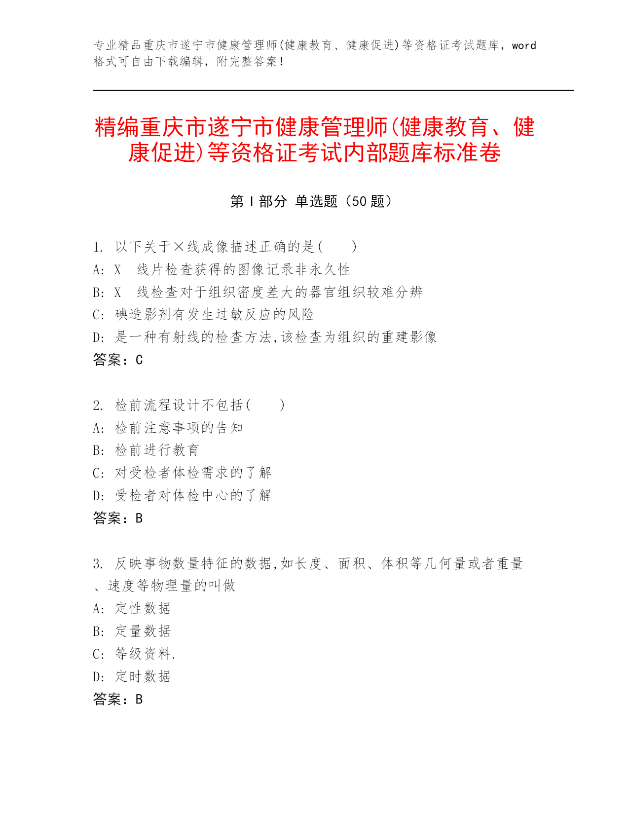 精编重庆市遂宁市健康管理师(健康教育、健康促进)等资格证考试内部题库标准卷.docx