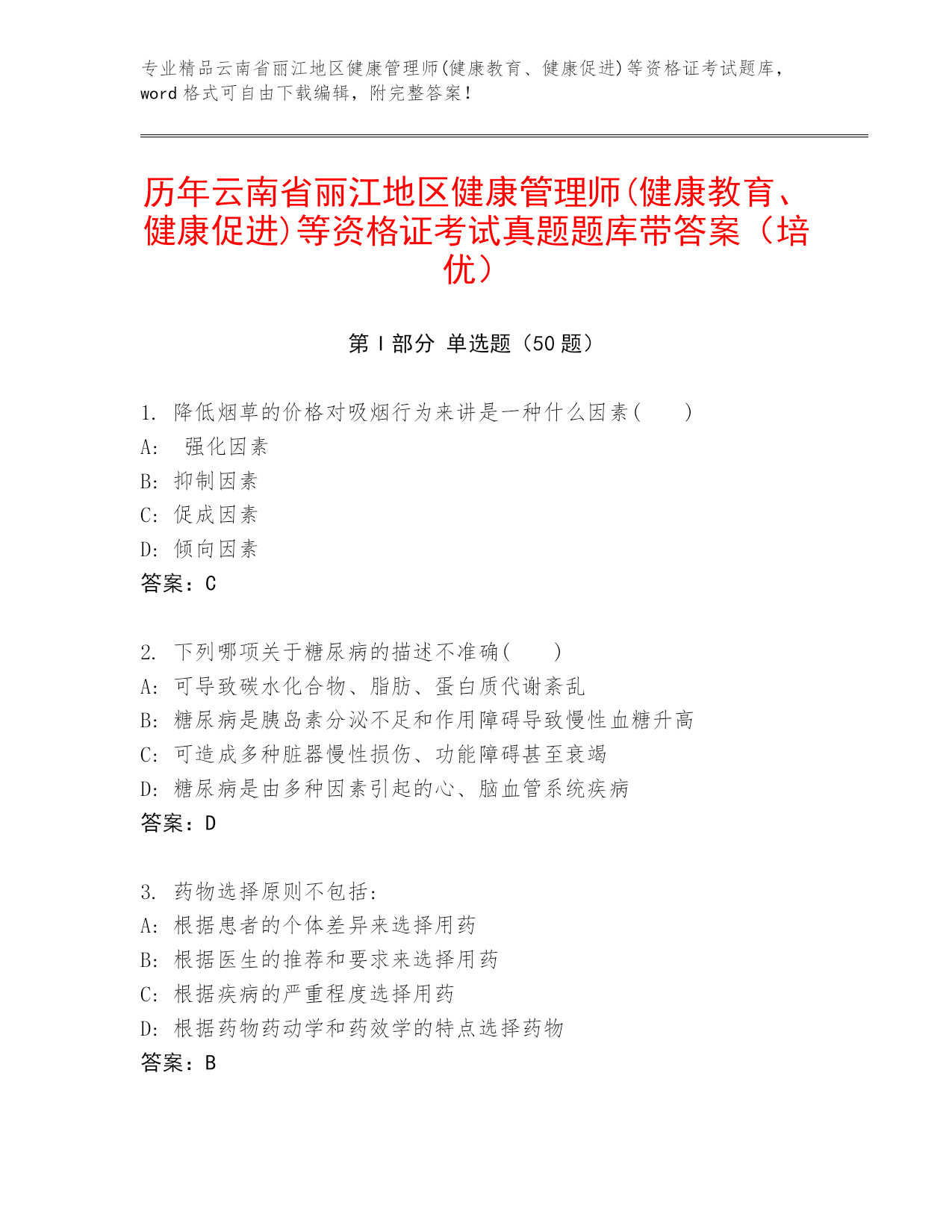 历年云南省丽江地区健康管理师(健康教育、健康促进)等资格证考试真题题库带答案(培优).docx