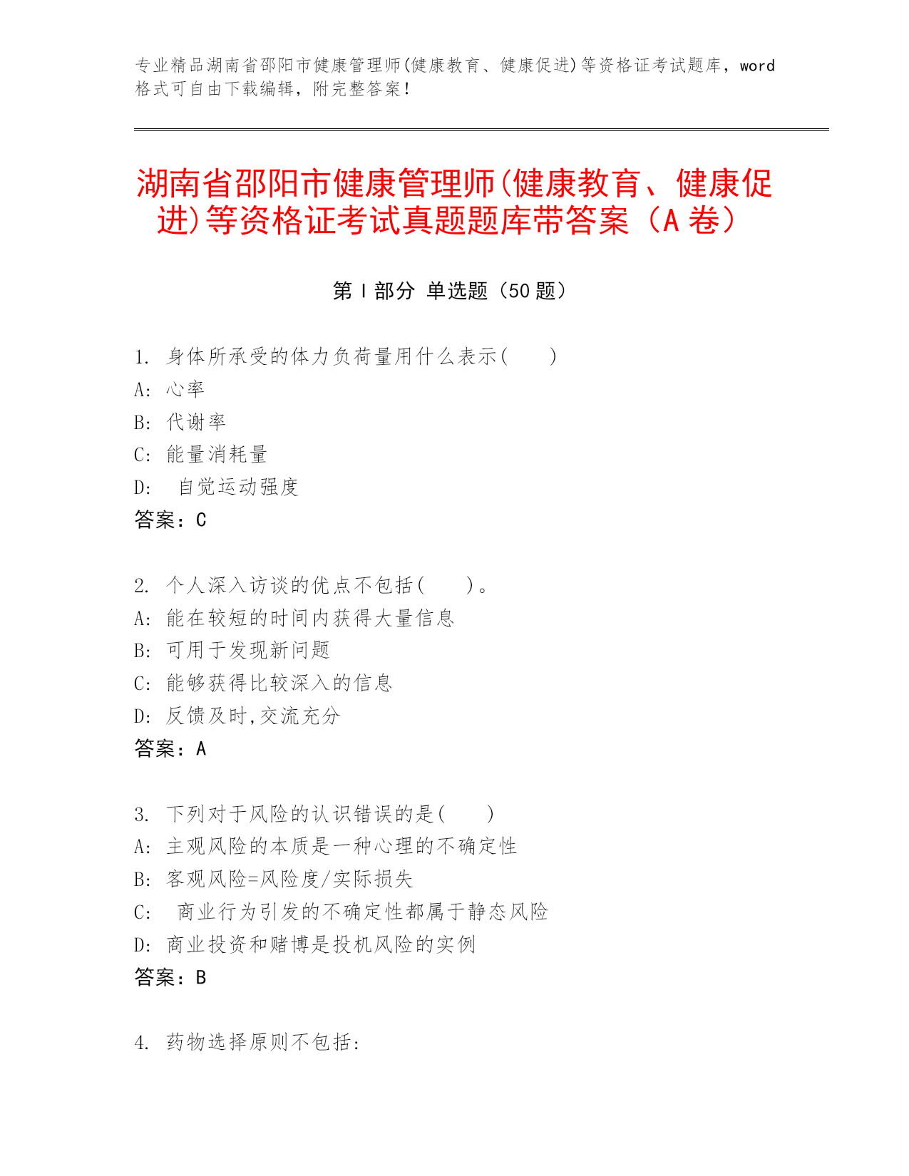 湖南省邵阳市健康管理师(健康教育、健康促进)等资格证考试真题题库带答案(A卷).docx