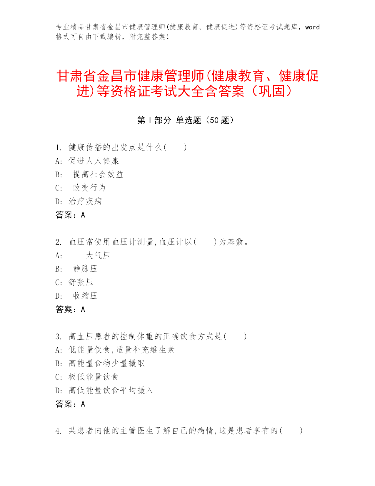 甘肃省金昌市健康管理师(健康教育、健康促进)等资格证考试大全含答案(巩固).docx