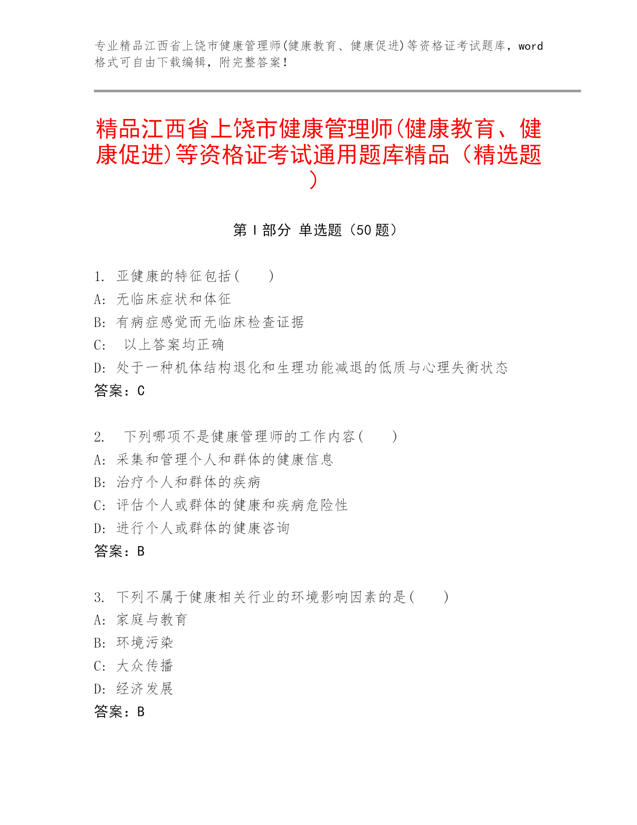 精品江西省上饶市健康管理师(健康教育、健康促进)等资格证考试通用题库精品(精选题).docx