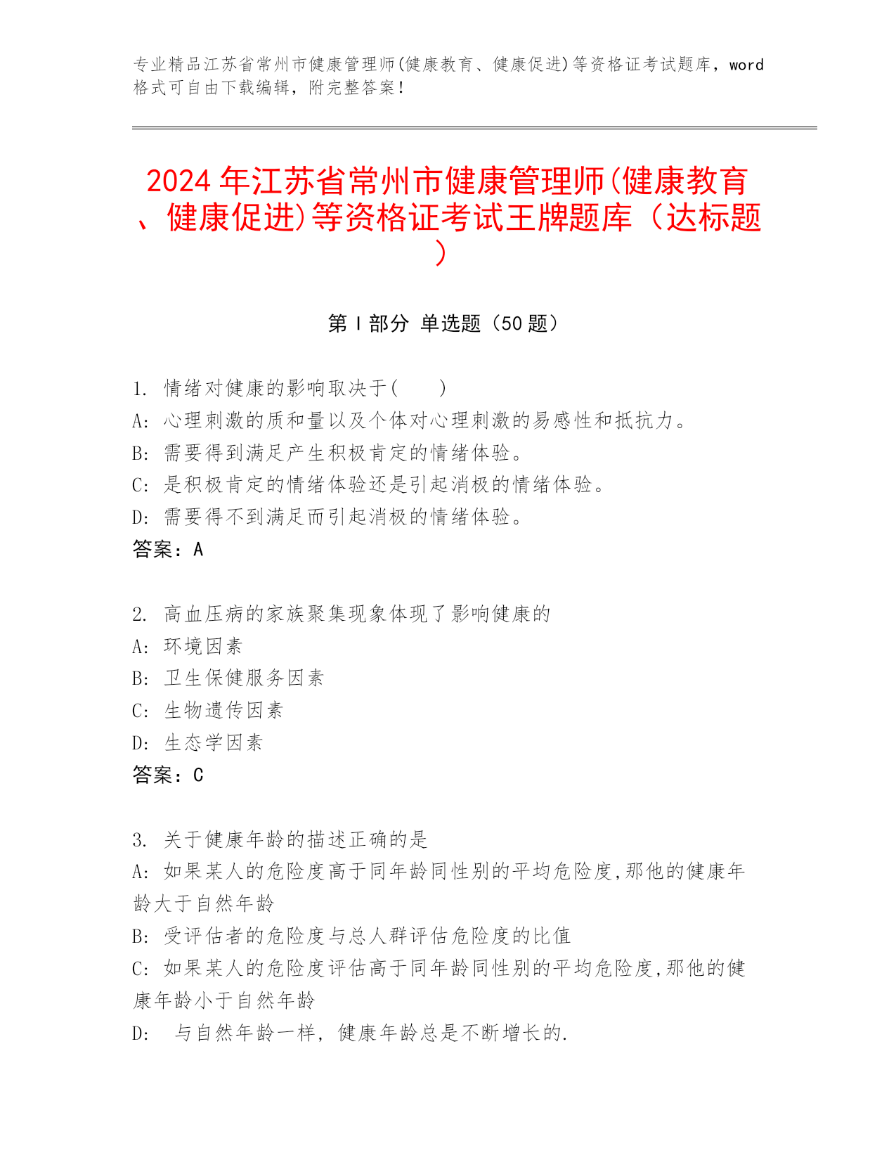 2024年江苏省常州市健康管理师(健康教育、健康促进)等资格证考试王牌题库(达标题).docx