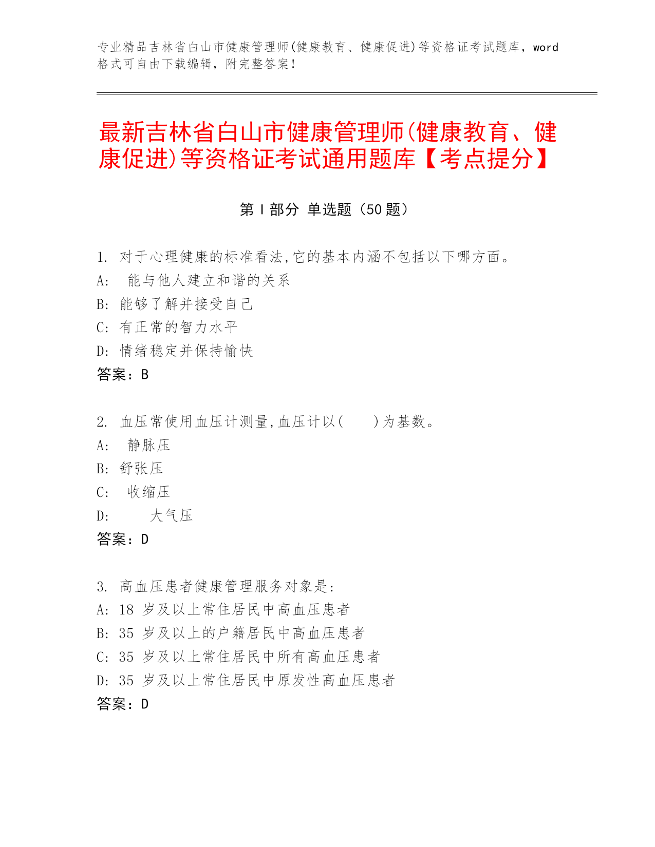 最新吉林省白山市健康管理师(健康教育、健康促进)等资格证考试通用题库【考点提分】.docx