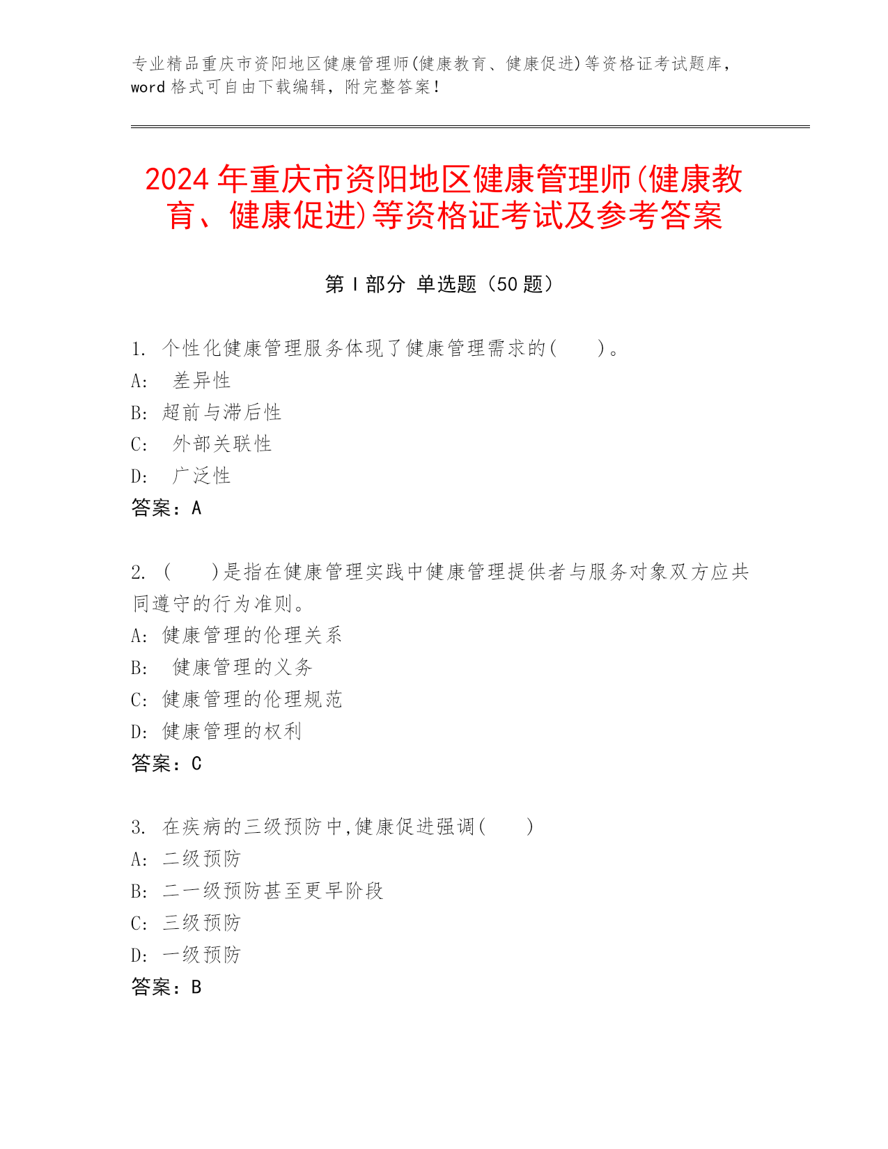 2024年重庆市资阳地区健康管理师(健康教育、健康促进)等资格证考试及参考答案.docx