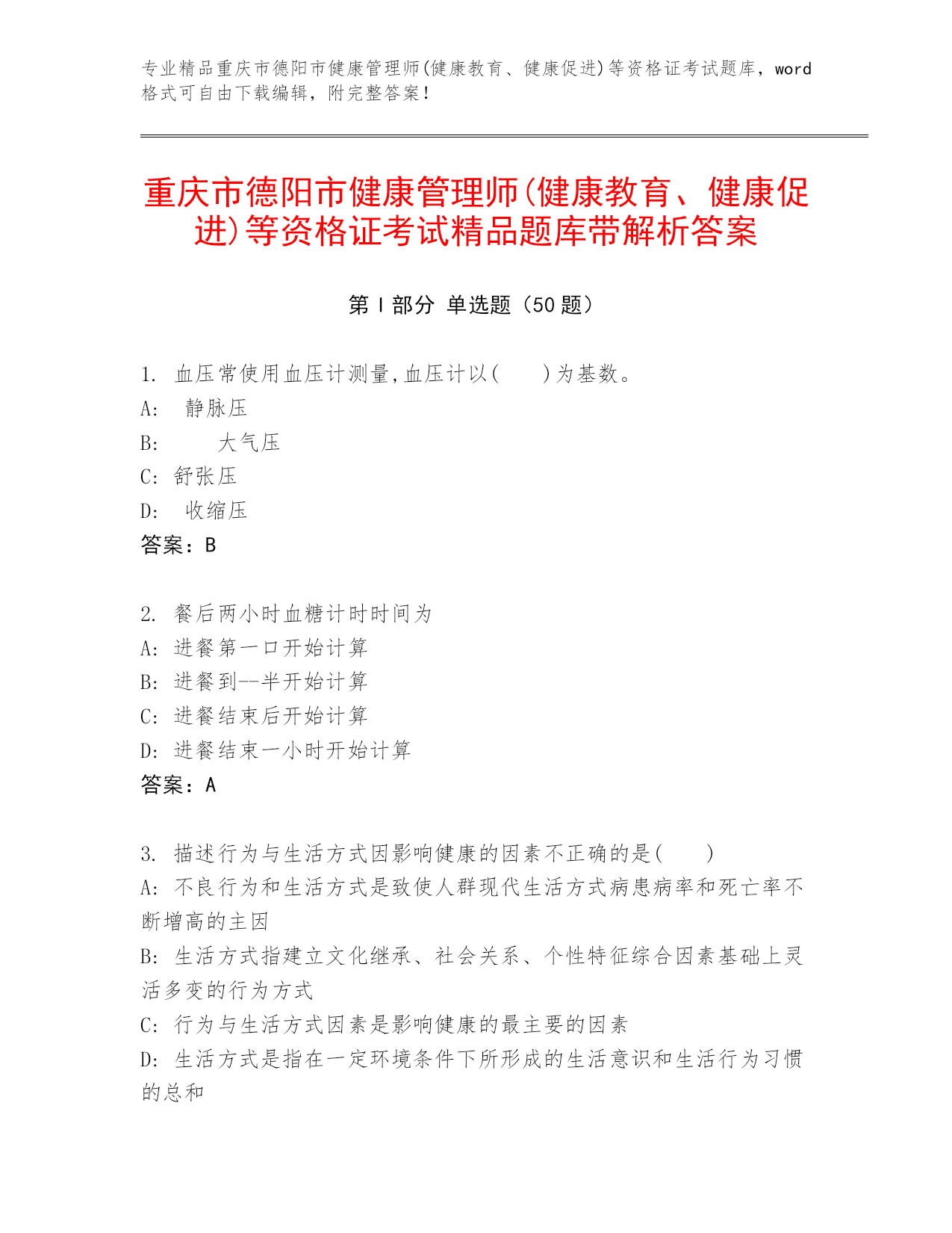 重庆市德阳市健康管理师(健康教育、健康促进)等资格证考试精品题库带解析答案.docx