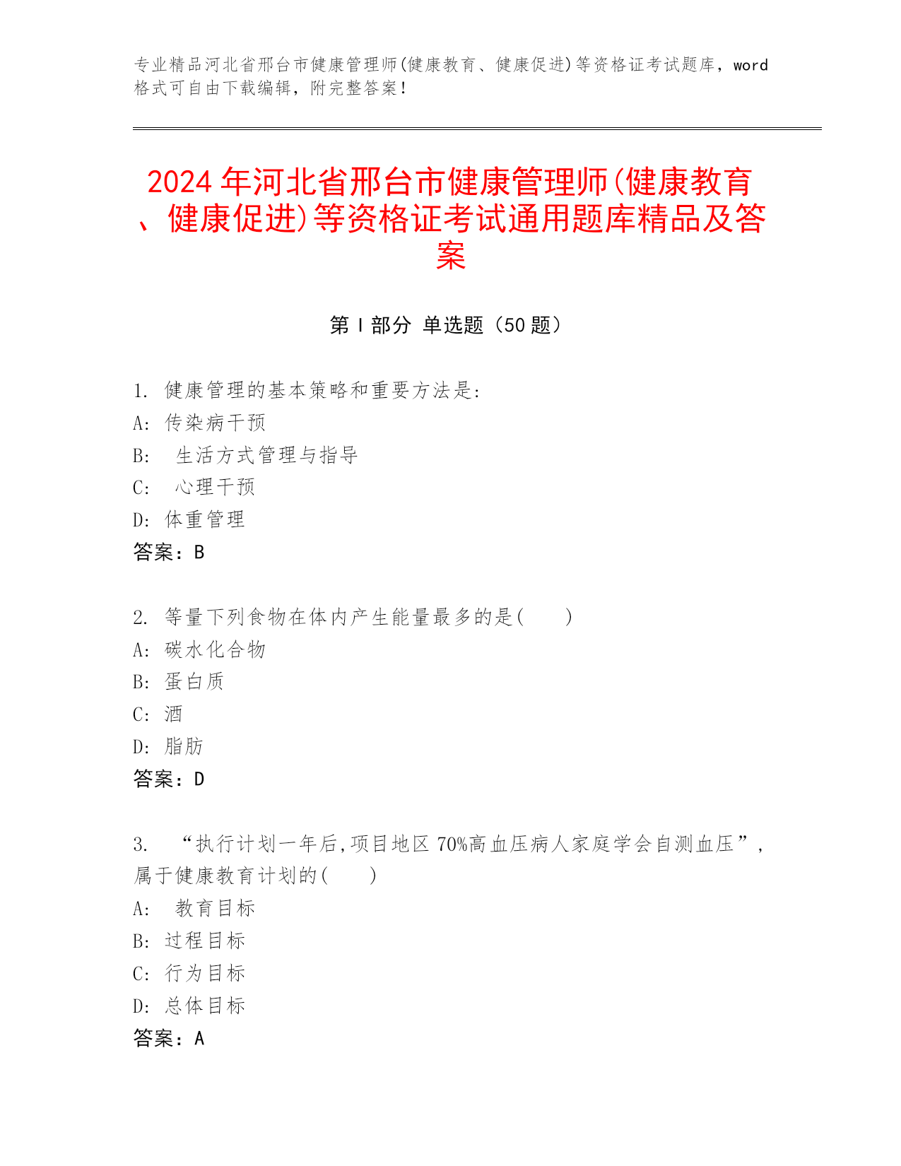 2024年河北省邢台市健康管理师(健康教育、健康促进)等资格证考试通用题库精品及答案.docx