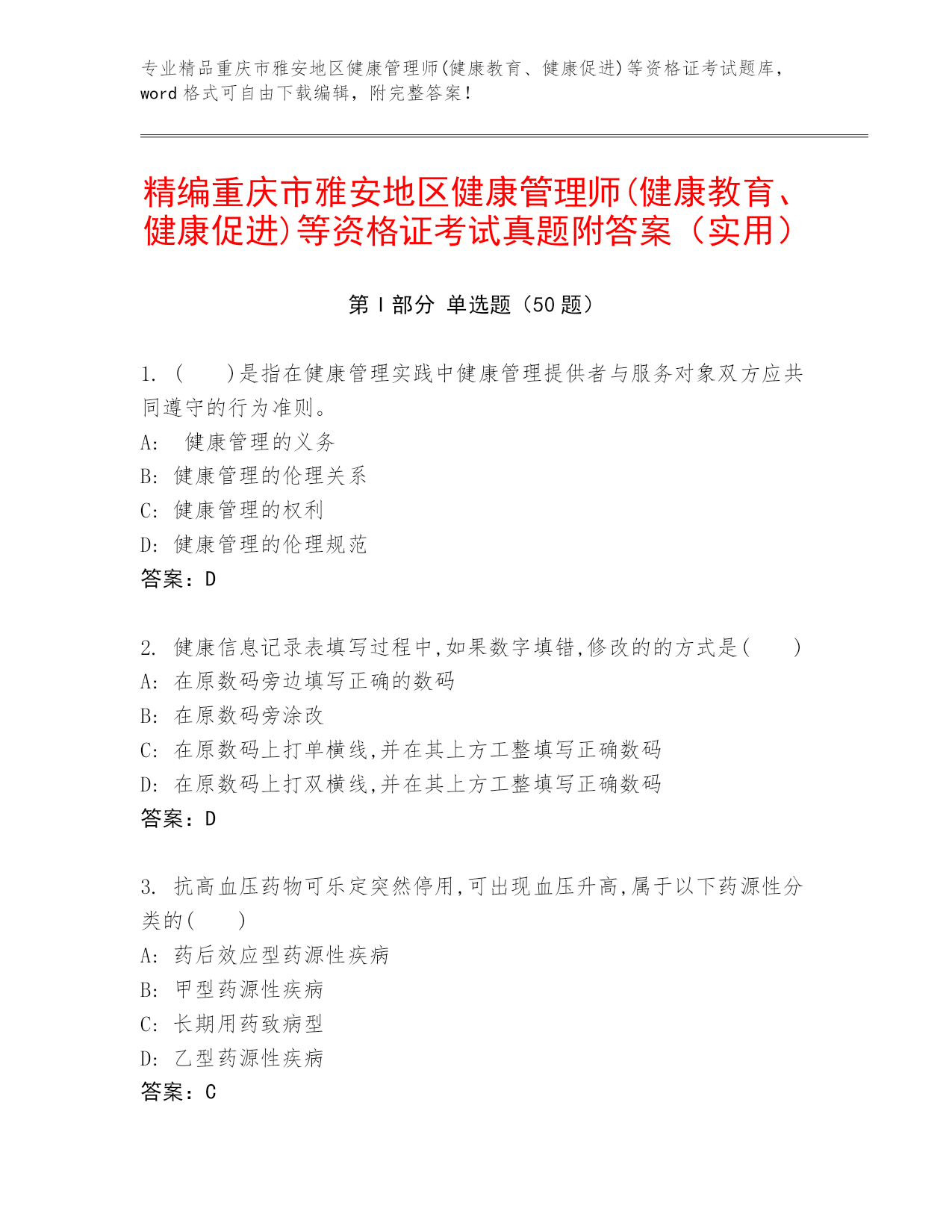 精编重庆市雅安地区健康管理师(健康教育、健康促进)等资格证考试真题附答案(实用).docx