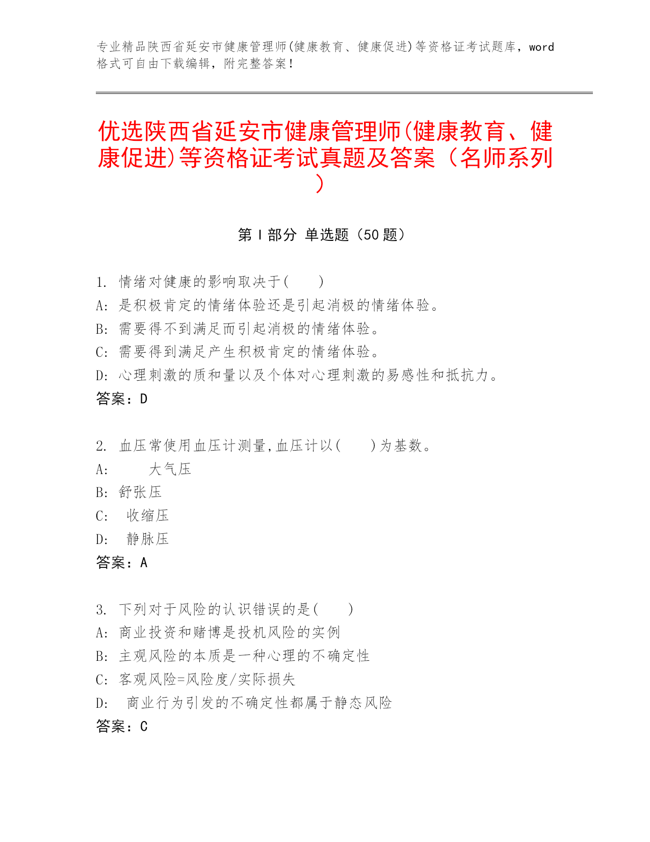 优选陕西省延安市健康管理师(健康教育、健康促进)等资格证考试真题及答案(名师系列).docx