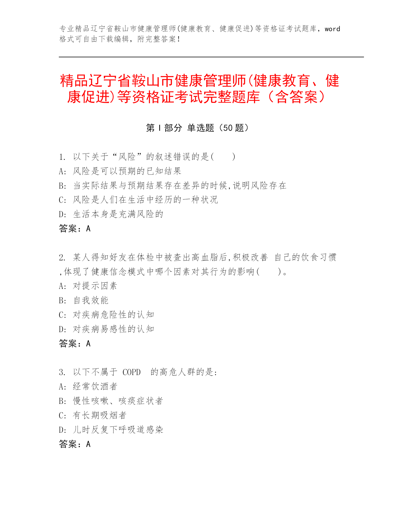 精品辽宁省鞍山市健康管理师(健康教育、健康促进)等资格证考试完整题库(含答案).docx