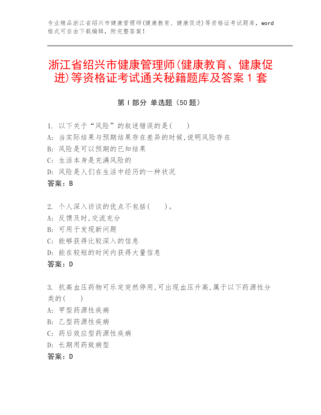 浙江省绍兴市健康管理师(健康教育、健康促进)等资格证考试通关秘籍题库及答案1套.docx