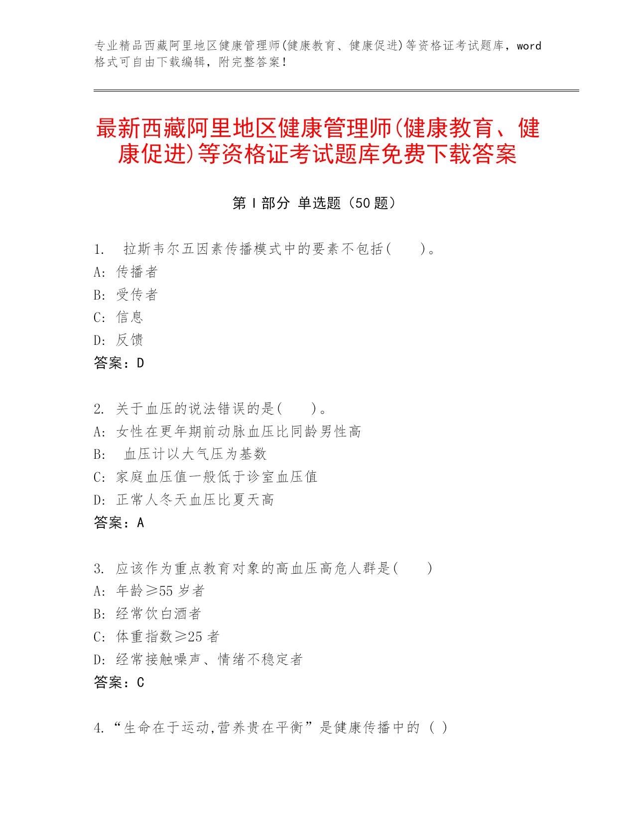 最新西藏阿里地区健康管理师(健康教育、健康促进)等资格证考试题库免费下载答案.docx