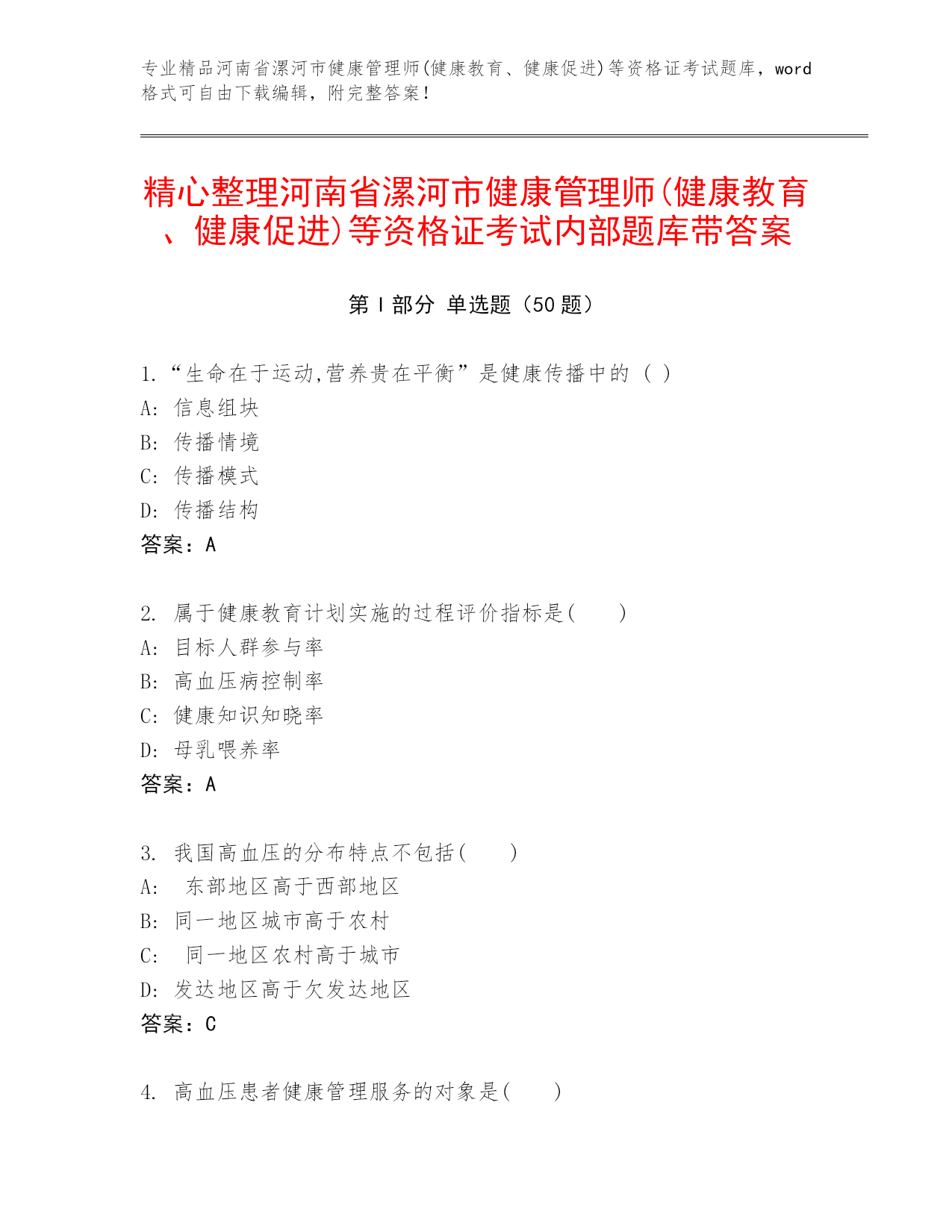 精心整理河南省漯河市健康管理师(健康教育、健康促进)等资格证考试内部题库带答案.docx