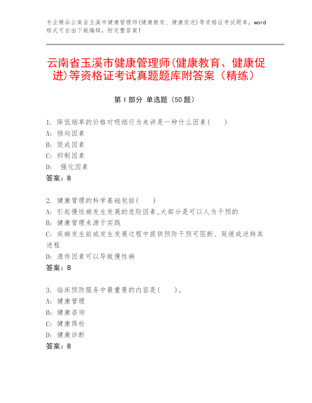 云南省玉溪市健康管理师(健康教育、健康促进)等资格证考试真题题库附答案(精练).docx