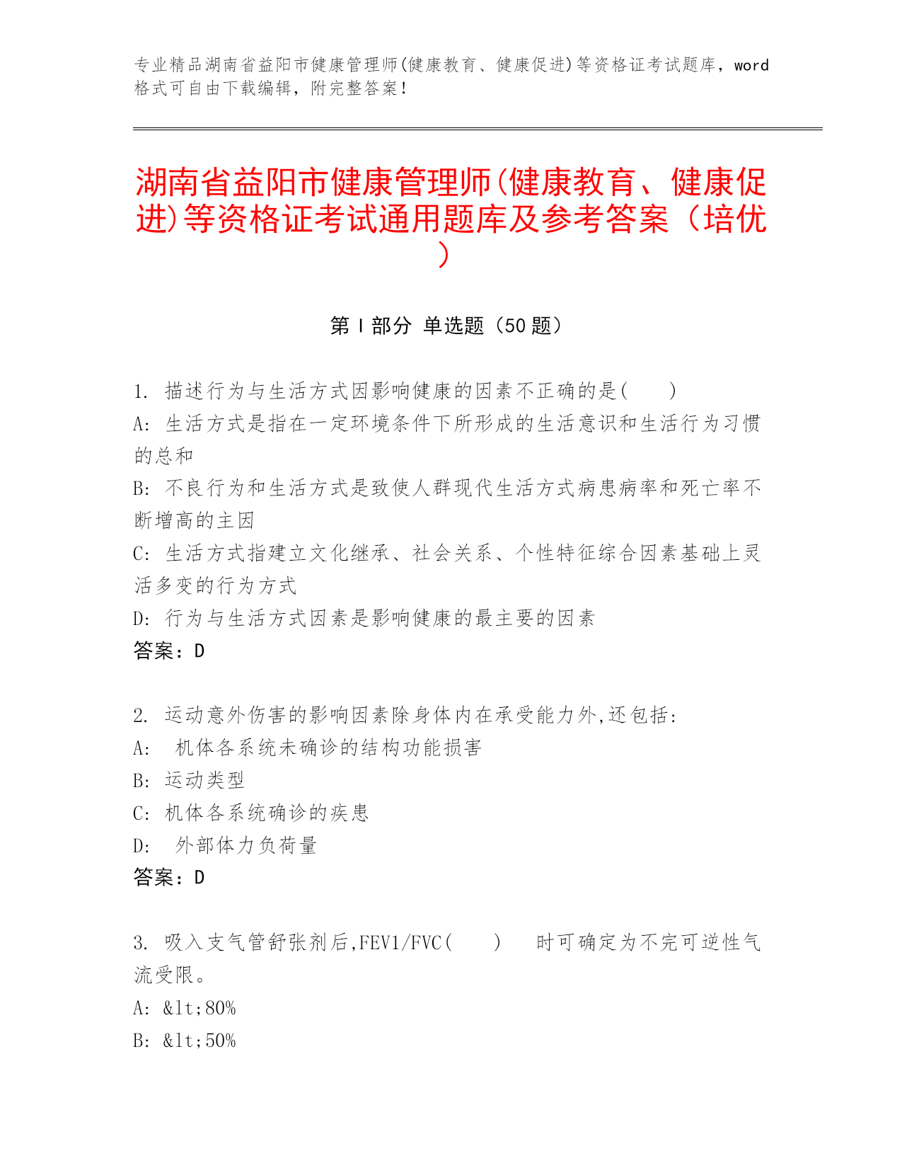 湖南省益阳市健康管理师(健康教育、健康促进)等资格证考试通用题库及参考答案(培优).docx