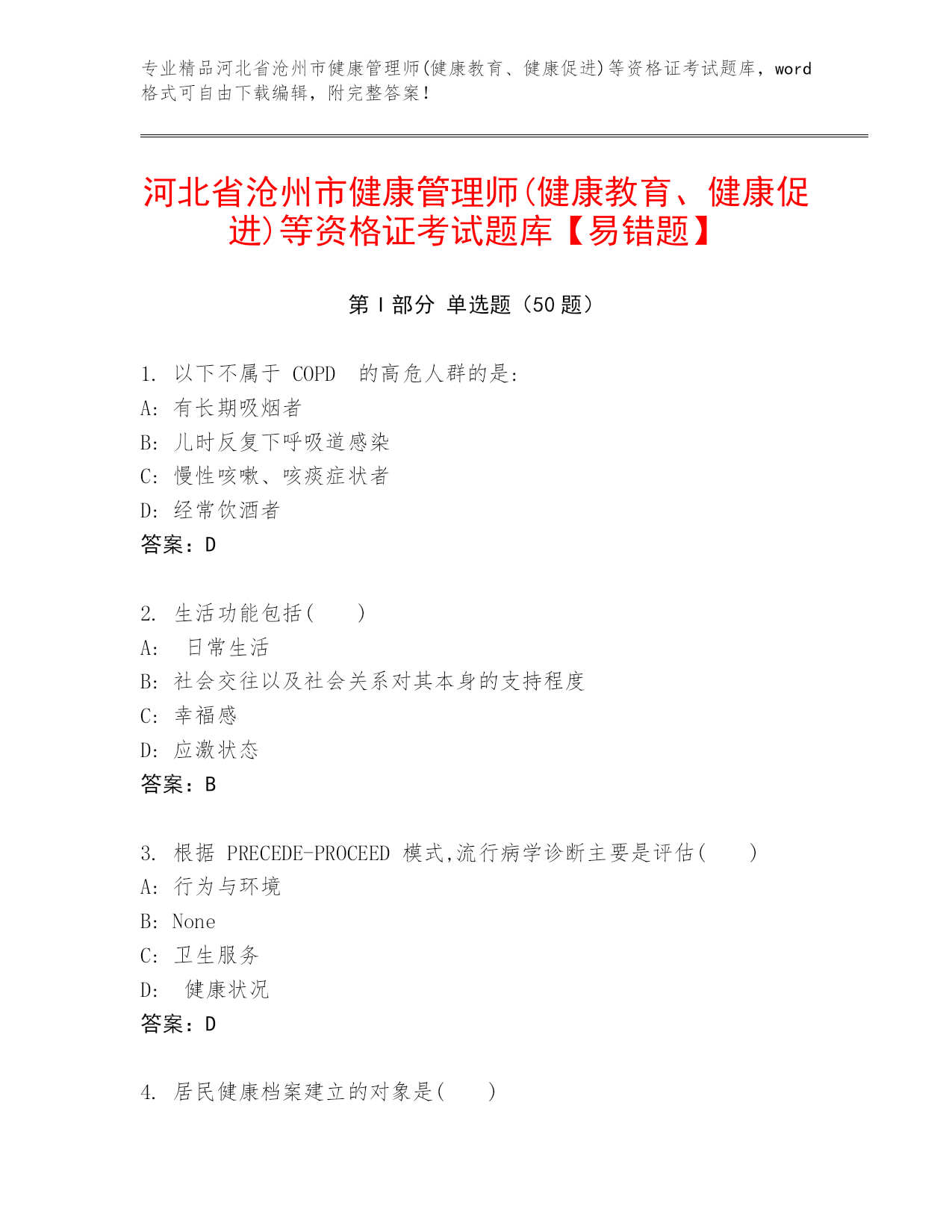 河北省沧州市健康管理师(健康教育、健康促进)等资格证考试题库【易错题】.docx