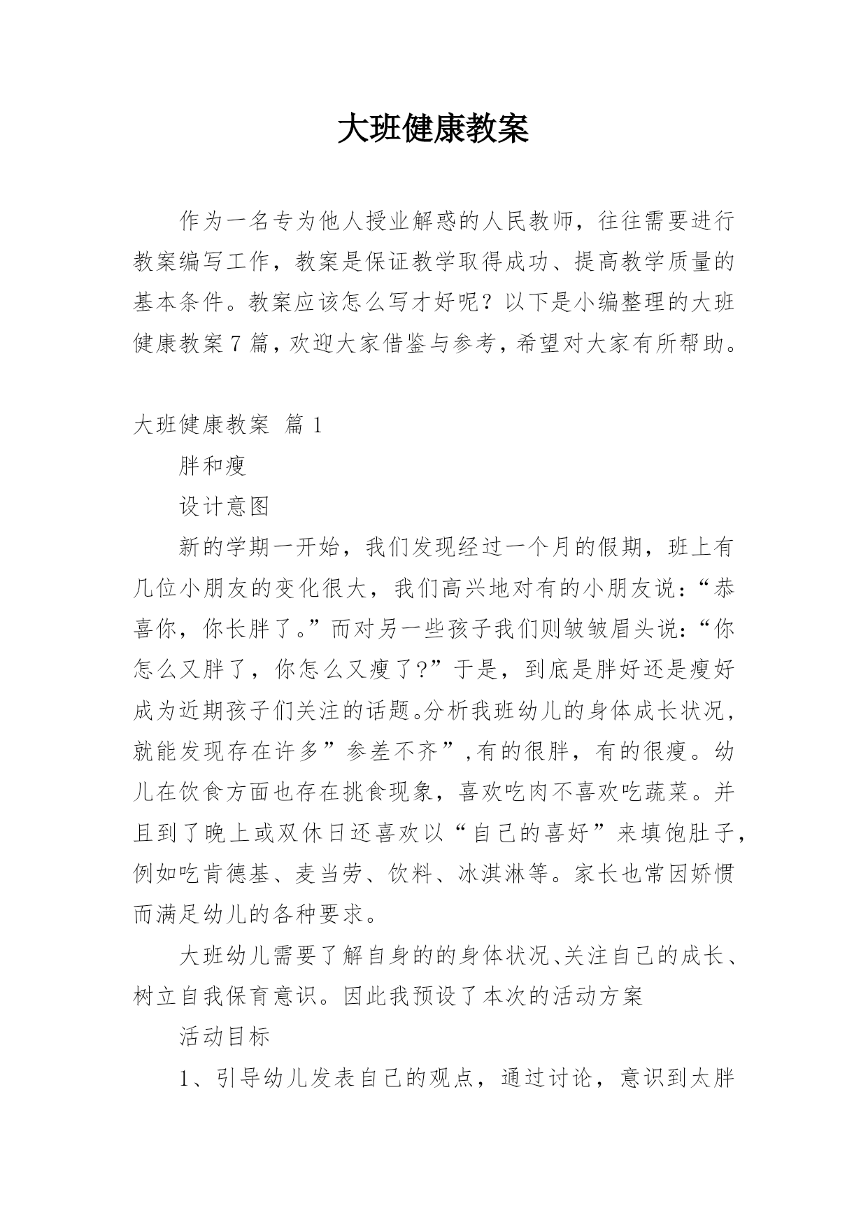 大班健康教案作为一名专为他人授业解惑的人民教师,往往需要进行教案编写工作,教案是保证教学取得成功、提高教学质量的基本条件。教案应该怎么写才好呢?以下是小编整理的大班健康教案7篇,欢迎大家借鉴与参考,希望对大家有所帮助。大班健康教案篇1胖和瘦设计意图新的学期一开始,我们发现经过一个月的假期,班上有几位小朋友的变化很大,我们高兴地对有的小朋友说:“恭喜你,你长胖了。”而对另一些孩子我们则皱皱眉头说:“你怎么又胖了,你怎么又瘦了?”于是,到底是胖好还是瘦好成为近期孩子们关注的话题。分析我班幼儿的身体成长状况,就