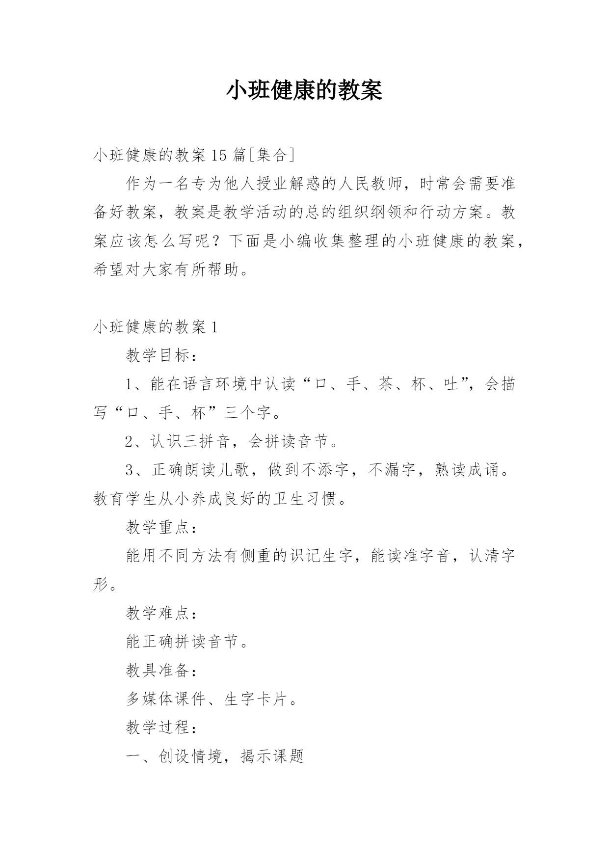 小班健康的教案小班健康的教案15篇[集合]作为一名专为他人授业解惑的人民教师,时常会需要准备好教案,教案是教学活动的总的组织纲领和行动方案。教案应该怎么写呢?下面是小编收集整理的小班健康的教案,希望对大家有所帮助。小班健康的教案1教学目标:1、能在语言环境中认读“口、手、茶、杯、吐”,会描写“口、手、杯”三个字。2、认识三拼音,会拼读音节。3、正确朗读儿歌,做到不添字,不漏字,熟读成诵。教育学生从小养成良好的卫生习惯。教学重点:能用不同方法有侧重的识记生字,能读准字音,认清字形。教学难点:能正确拼读音节。