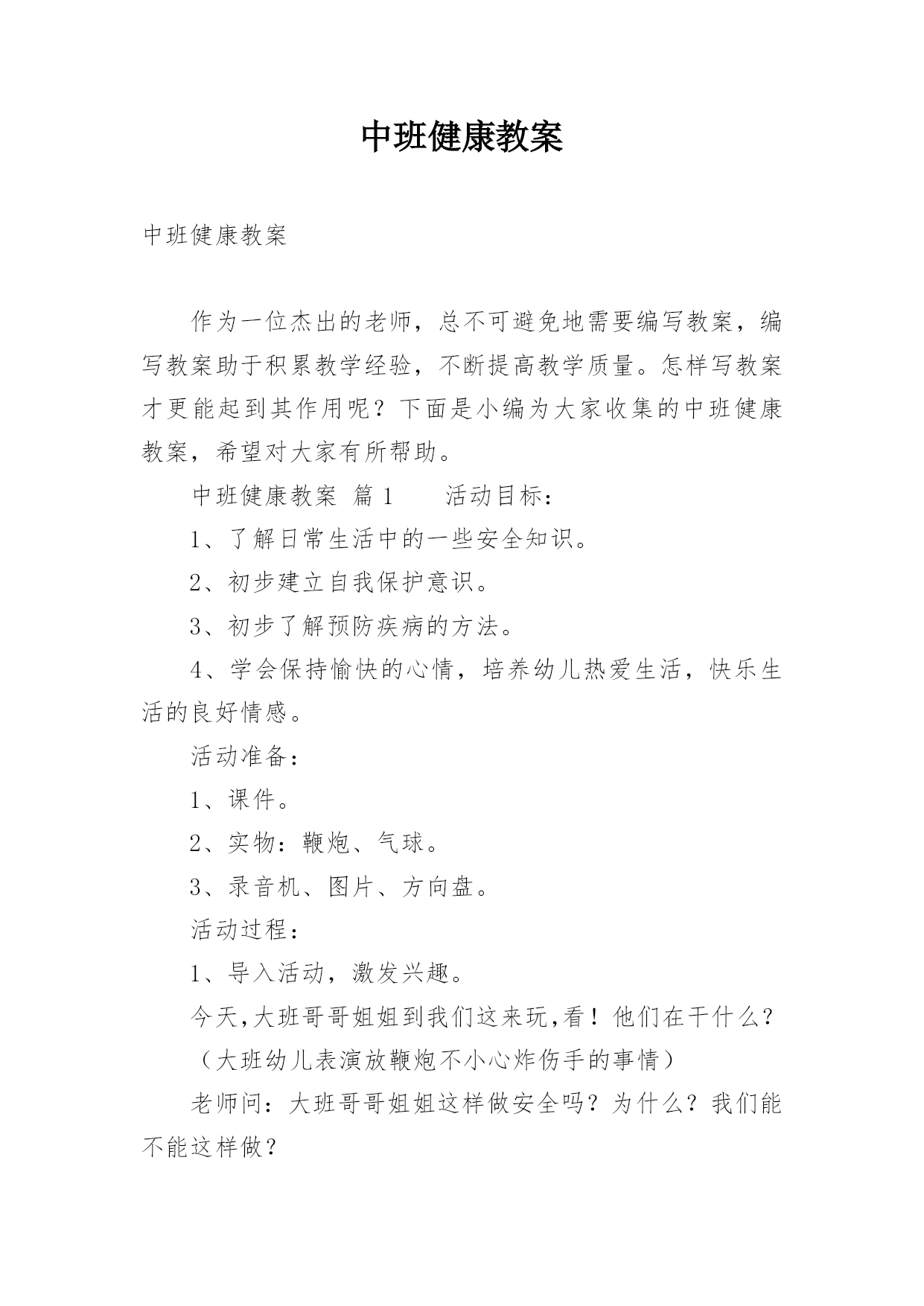 中班健康教案中班健康教案作为一位杰出的老师,总不可避免地需要编写教案,编写教案助于积累教学经验,不断提高教学质量。怎样写教案才更能起到其作用呢?下面是小编为大家收集的中班健康教案,希望对大家有所帮助。中班健康教案篇1活动目标:1、了解日常生活中的一些安全知识。2、初步建立自我保护意识。3、初步了解预防疾病的方法。4、学会保持愉快的心情,培养幼儿热爱生活,快乐生活的良好情感。活动准备:1、课件。2、实物:鞭炮、气球。3、录音机、图片、方向盘。活动过程:1、导入活动,激发兴趣。今天,大班哥哥姐姐到我们这来玩,