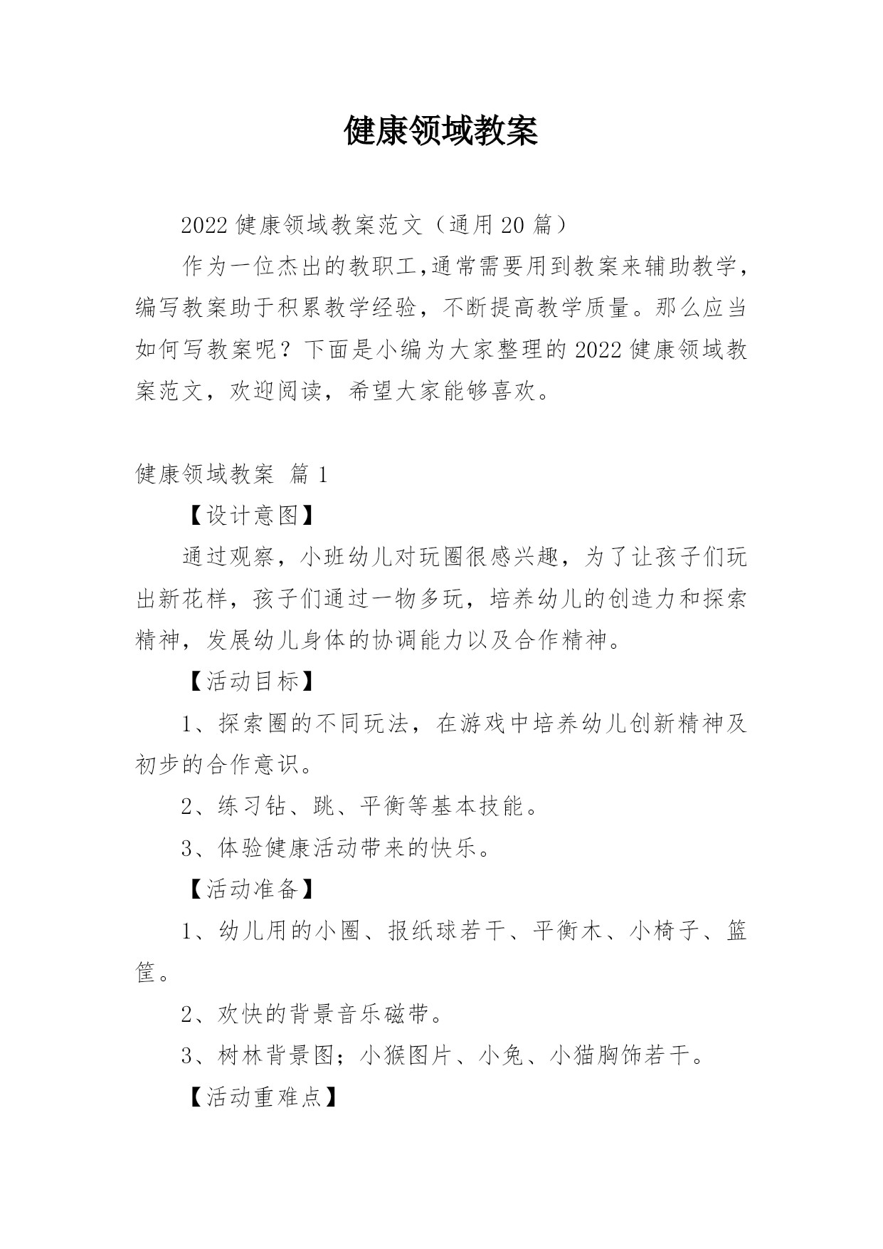 健康领域教案2022健康领域教案范文(通用20篇)作为一位杰出的教职工,通常需要用到教案来辅助教学,编写教案助于积累教学经验,不断提高教学质量。那么应当如何写教案呢?下面是小编为大家整理的2022健康领域教案范文,欢迎阅读,希望大家能够喜欢。健康领域教案篇1【设计意图】通过观察,小班幼儿对玩圈很感兴趣,为了让孩子们玩出新花样,孩子们通过一物多玩,培养幼儿的创造力和探索精神,发展幼儿身体的协调能力以及合作精神。【活动目标】1、探索圈的不同玩法,在游戏中培养幼儿创新精神及初步的合作意识。2、练习钻、跳、平衡等