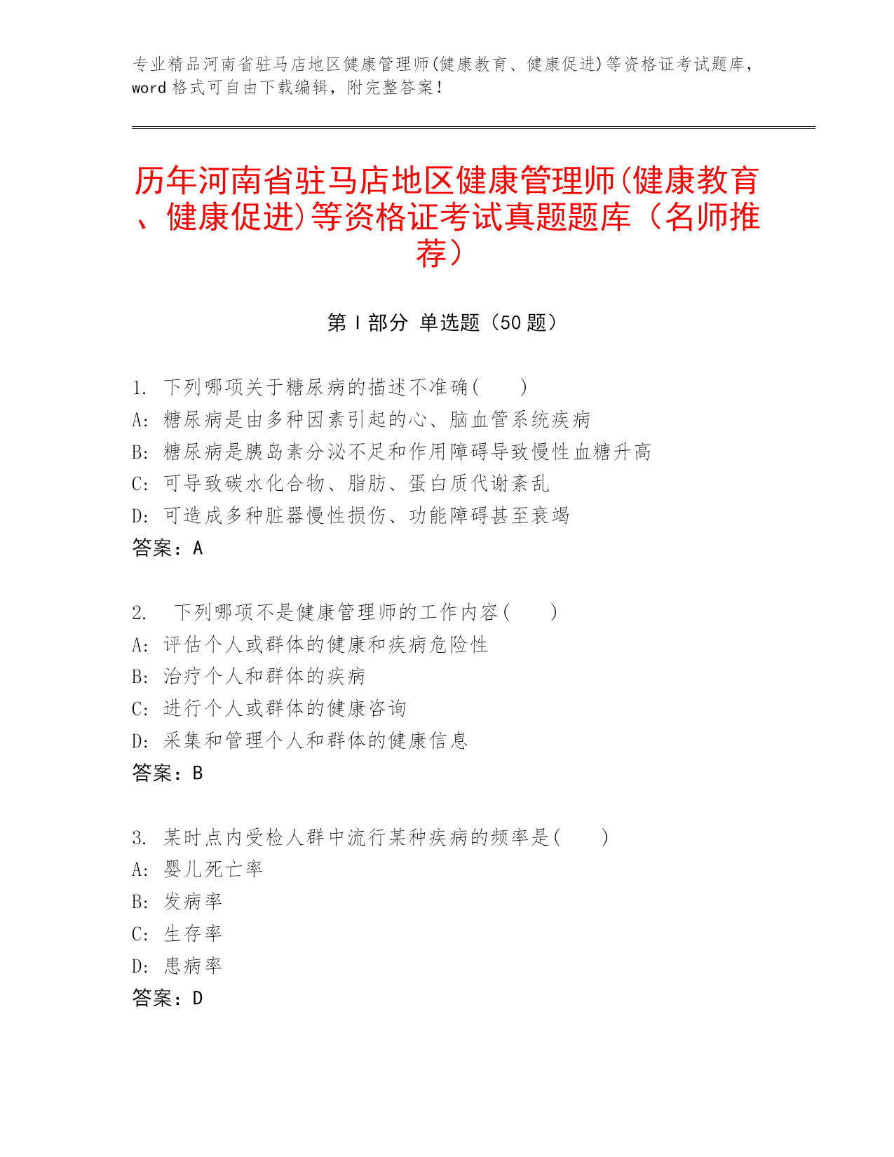 专业精品河南省驻马店地区健康管理师(健康教育、健康促进)等资格证考试题库,word格式可自由下载编辑,附完整答案!历年河南省驻马店地区健康管理师(健康教育、健康促进)等资格证考试真题题库(名师推荐)第I部分单选题(50题)1.下列哪项关于糖尿病的描述不准确()A:糖尿病是由多种因素引起的心、脑血管系统疾病B:糖尿病是胰岛素分泌不足和作用障碍导致慢性血糖升高C:可导致碳水化合物、脂肪、蛋白质代谢紊乱D:可造成多种脏器慢性损伤、功能障碍甚至衰竭答案:A2.下列哪项不是健康管理师的工作内容()A:评估个人或群体