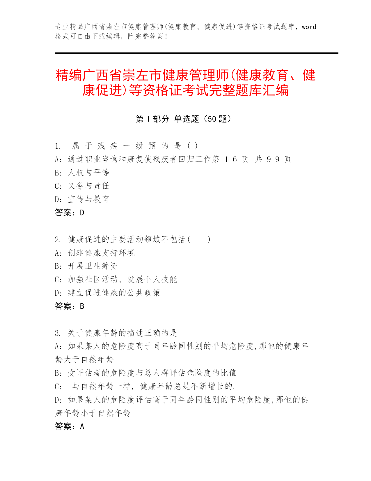 专业精品广西省崇左市健康管理师(健康教育、健康促进)等资格证考试题库,word格式可自由下载编辑,附完整答案!精编广西省崇左市健康管理师(健康教育、健康促进)等资格证考试完整题库汇编第I部分单选题(50题)1.属于残疾一级预的是()A:通过职业咨询和康复使残疾者回归工作B:人权与平等C:义务与责任D:宣传与教育答案:D2.健康促进的主要活动领域不包括()A:创建健康支持环境B:开展卫生筹资C:加强社区活动、发展个人技能D:建立促进健康的公共政策答案:B3.关于健康年龄的描述正确的是A:如果某人的危险度高于