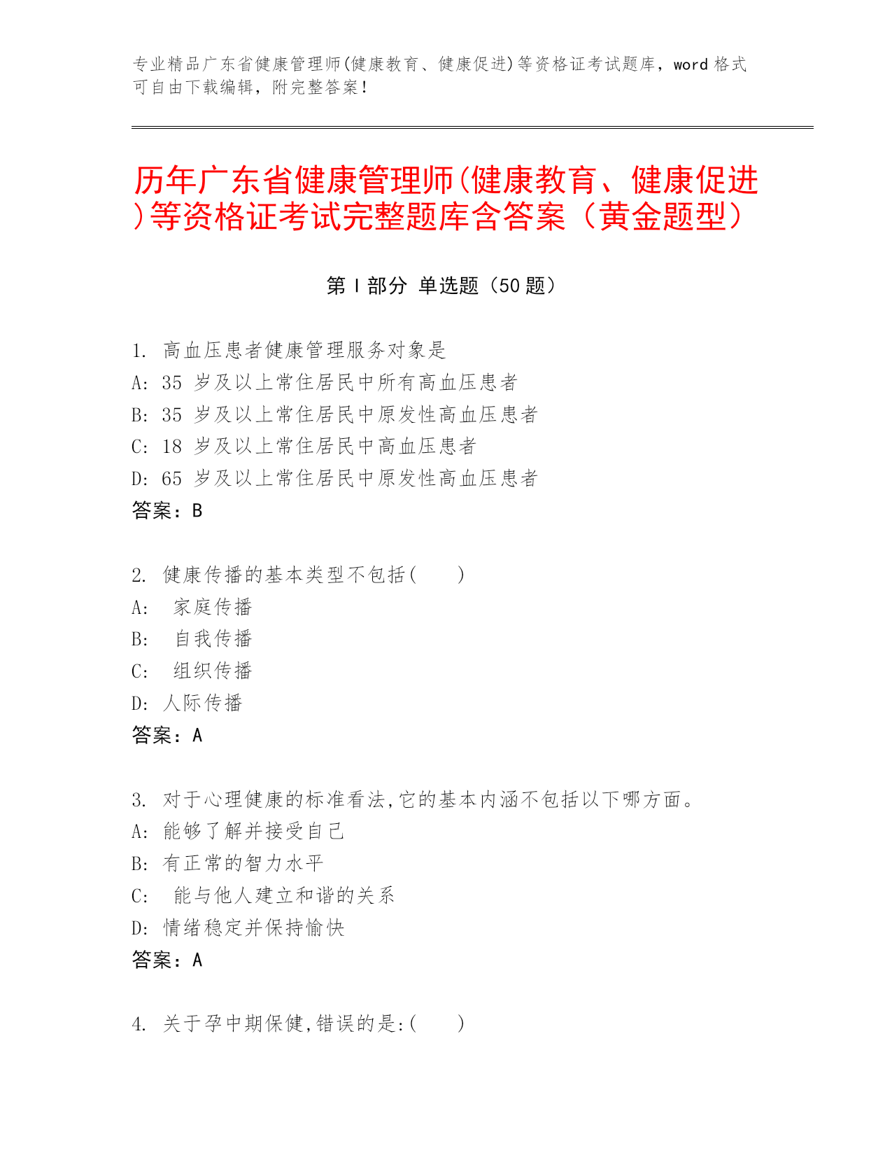 专业精品广东省健康管理师(健康教育、健康促进)等资格证考试题库,word格式可自由下载编辑,附完整答案!历年广东省健康管理师(健康教育、健康促进)等资格证考试完整题库含答案(黄金题型)第I部分单选题(50题)1.高血压患者健康管理服务对象是A:35岁及以上常住居民中所有高血压患者B:35岁及以上常住居民中原发性高血压患者C:18岁及以上常住居民中高血压患者D:65岁及以上常住居民中原发性高血压患者答案:B2.健康传播的基本类型不包括()A:家庭传播B:自我传播C:组织传播D:人际传播答案:A3.对于心理健