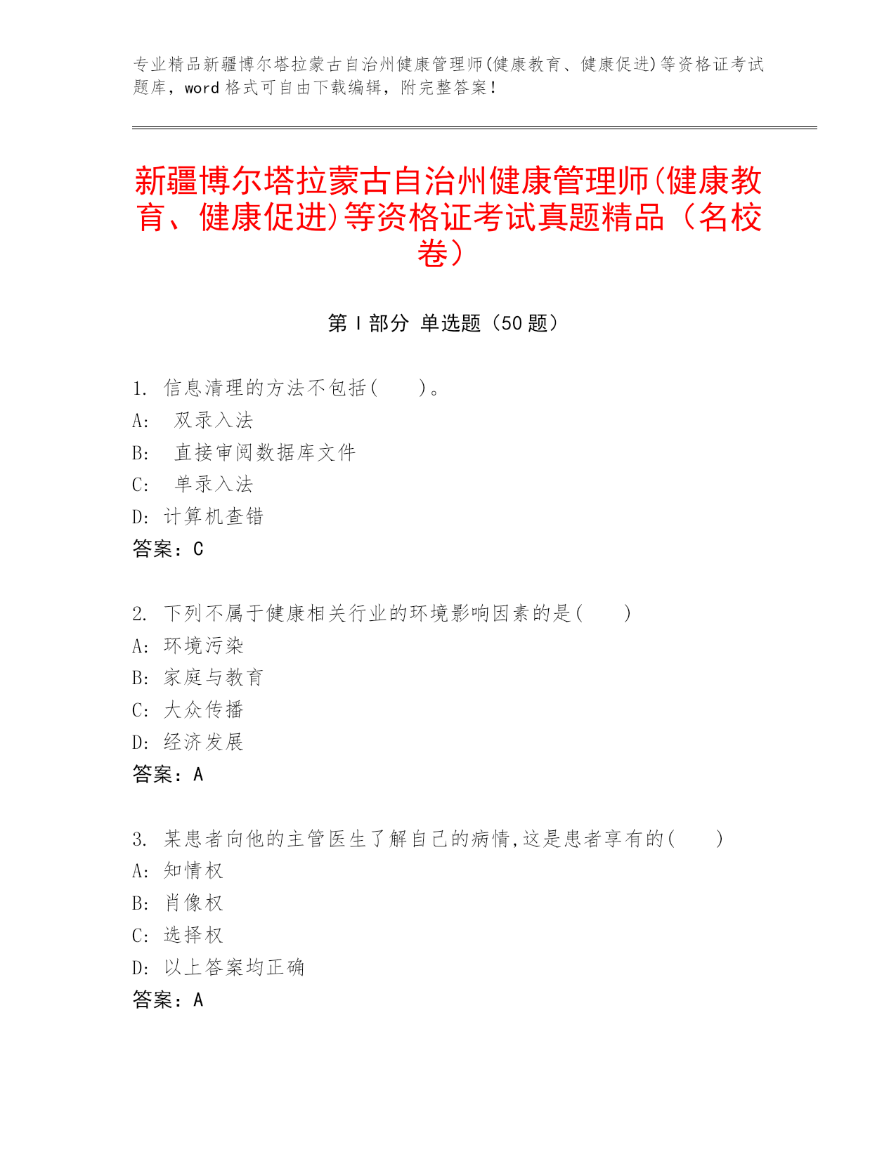专业精品新疆博尔塔拉蒙古自治州健康管理师(健康教育、健康促进)等资格证考试题库,word格式可自由下载编辑,附完整答案!新疆博尔塔拉蒙古自治州健康管理师(健康教育、健康促进)等资格证考试真题精品(名校卷)第I部分单选题(50题)1.信息清理的方法不包括()。A:双录入法B:直接审阅数据库文件C:单录入法D:计算机查错答案:C2.下列不属于健康相关行业的环境影响因素的是()A:环境污染B:家庭与教育C:大众传播D:经济发展答案:A3.某患者向他的主管医生了解自己的病情,这是患者享有的()A:知情权B:肖像权