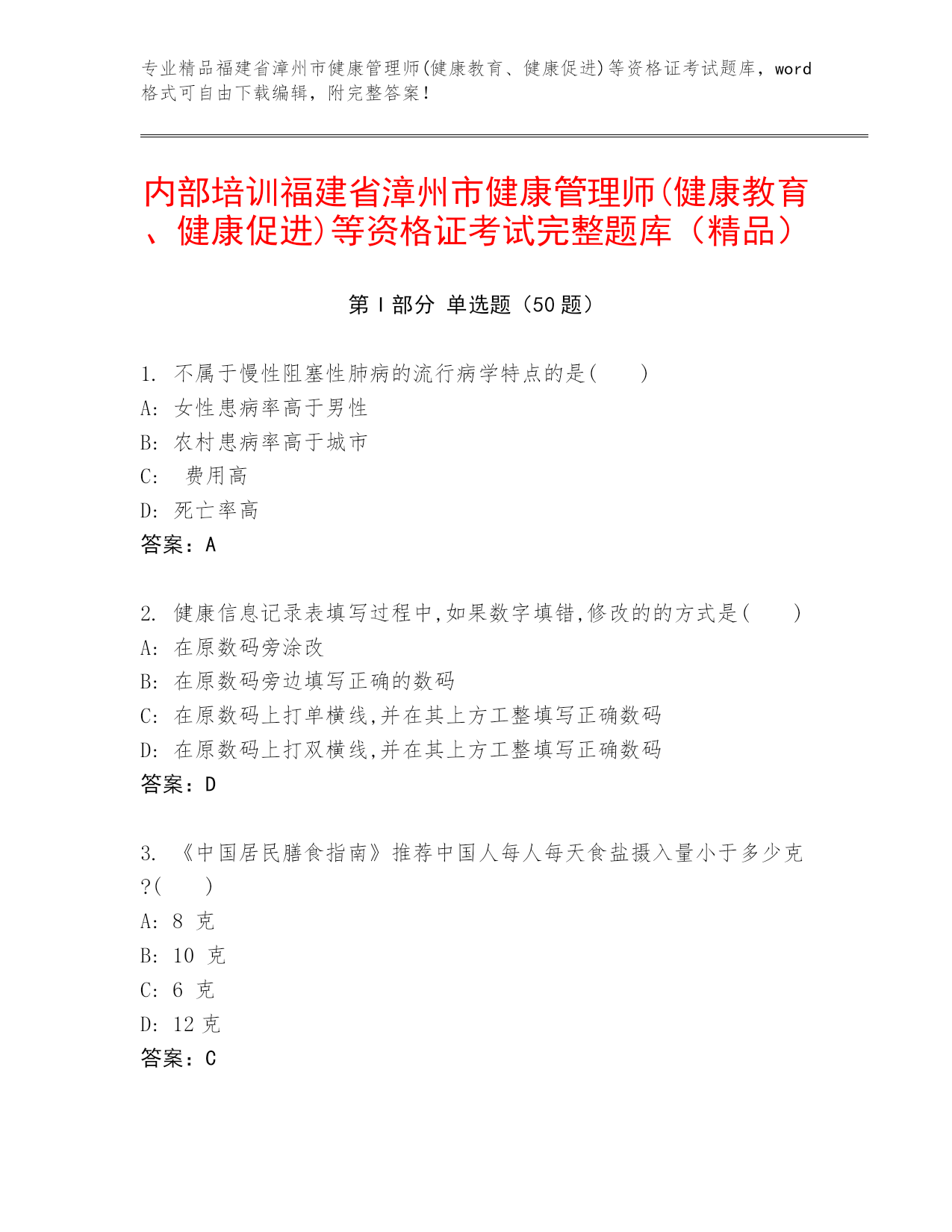 专业精品福建省漳州市健康管理师(健康教育、健康促进)等资格证考试题库,word格式可自由下载编辑,附完整答案!内部培训福建省漳州市健康管理师(健康教育、健康促进)等资格证考试完整题库(精品)第I部分单选题(50题)1.不属于慢性阻塞性肺病的流行病学特点的是()A:女性患病率高于男性B:农村患病率高于城市C:费用高D:死亡率高答案:A2.健康信息记录表填写过程中,如果数字填错,修改的的方式是()A:在原数码旁涂改B:在原数码旁边填写正确的数码C:在原数码上打单横线,并在其上方工整填写正确数码D:在原数码上打