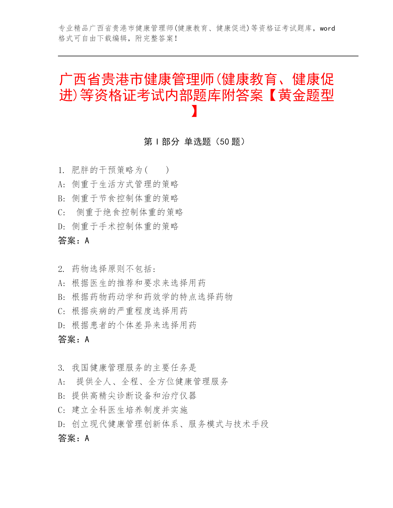 广西省贵港市健康管理师(健康教育、健康促进)等资格证考试内部题库附答案【黄金题型】.docx