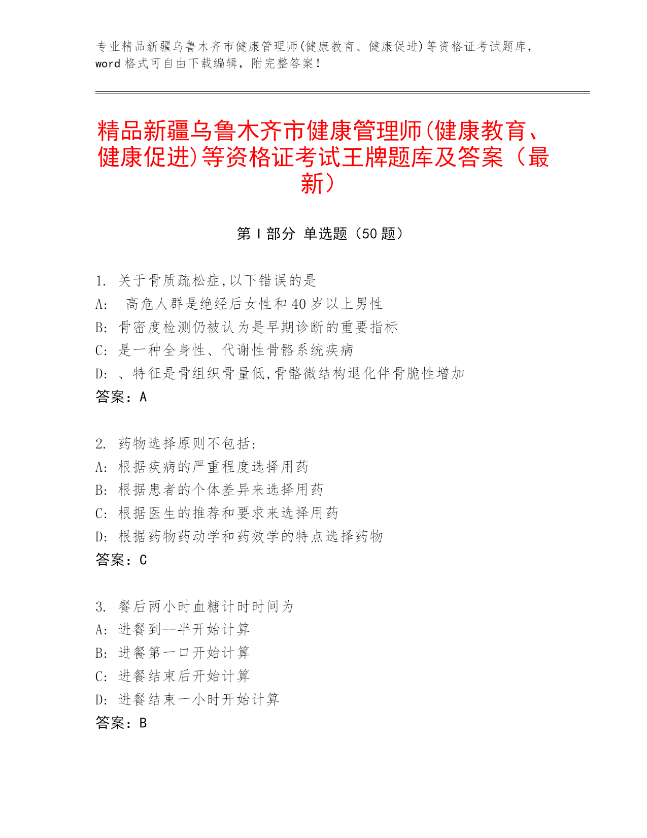 精品新疆乌鲁木齐市健康管理师(健康教育、健康促进)等资格证考试王牌题库及答案(最新).docx